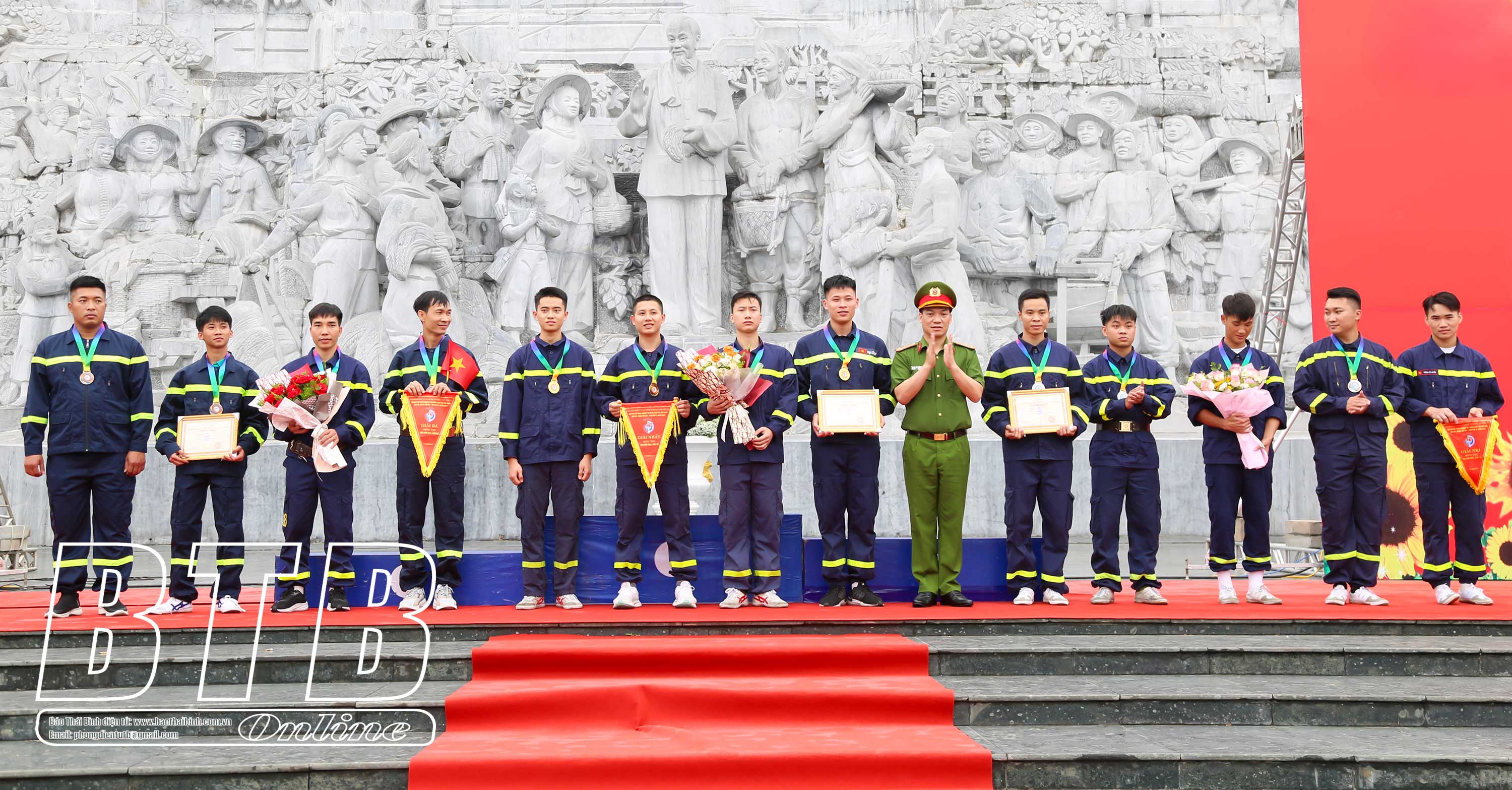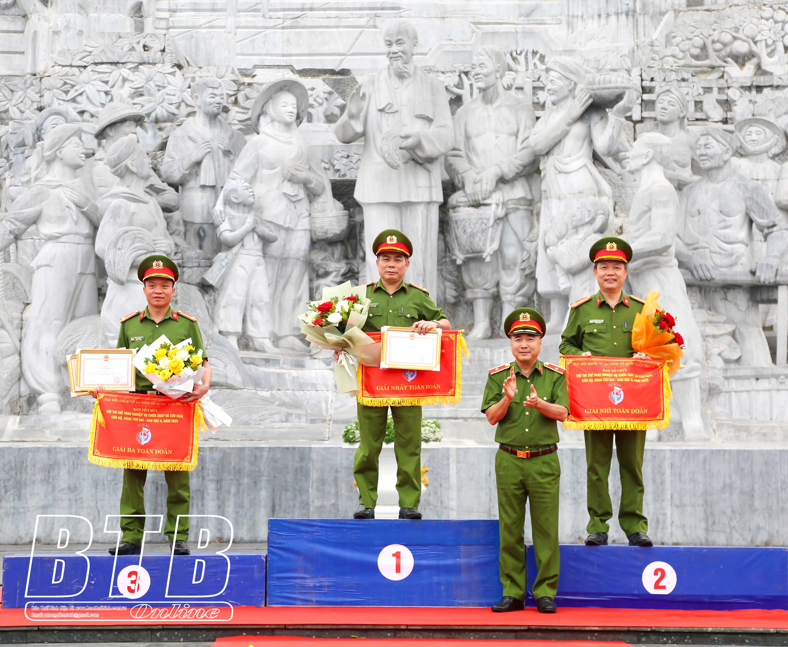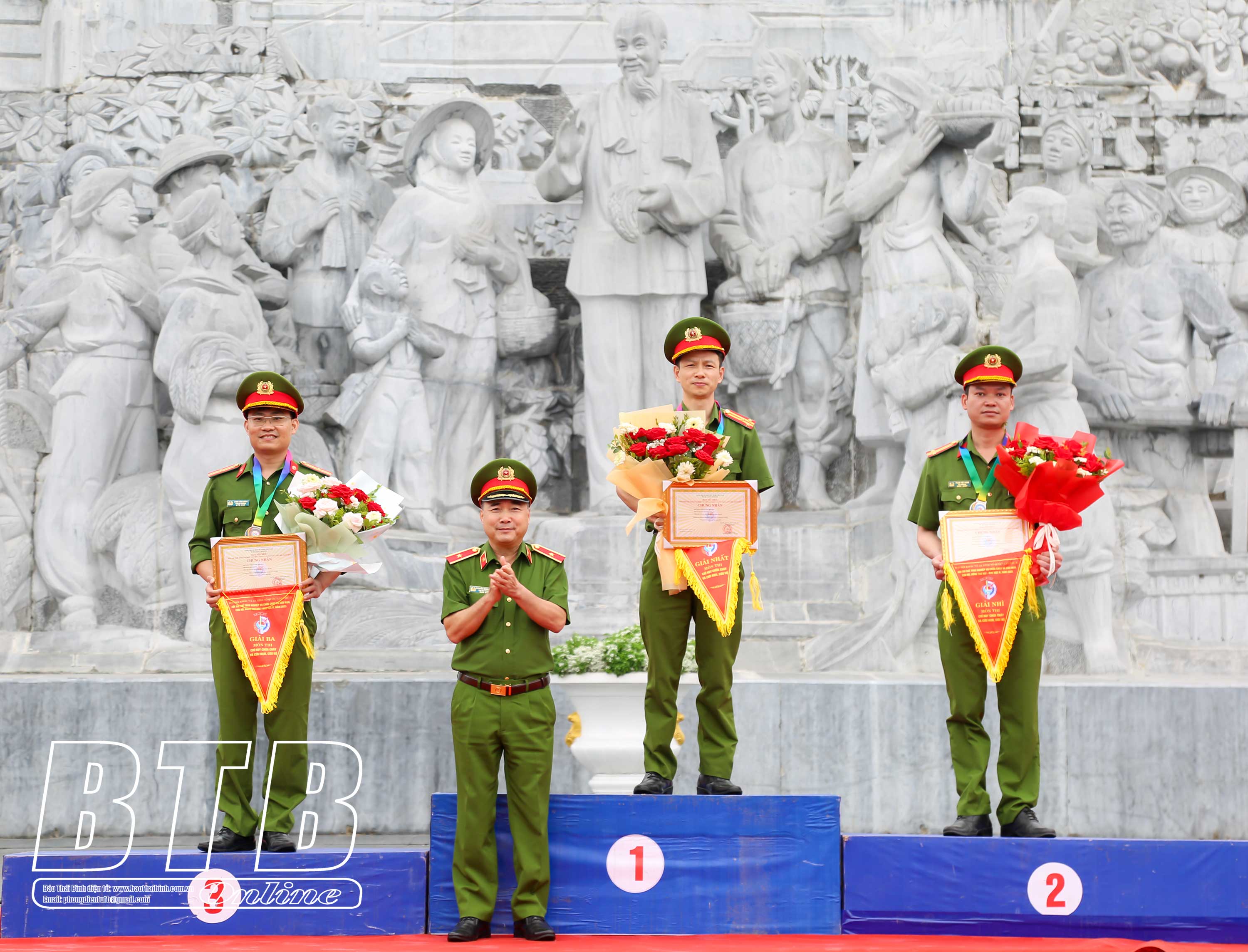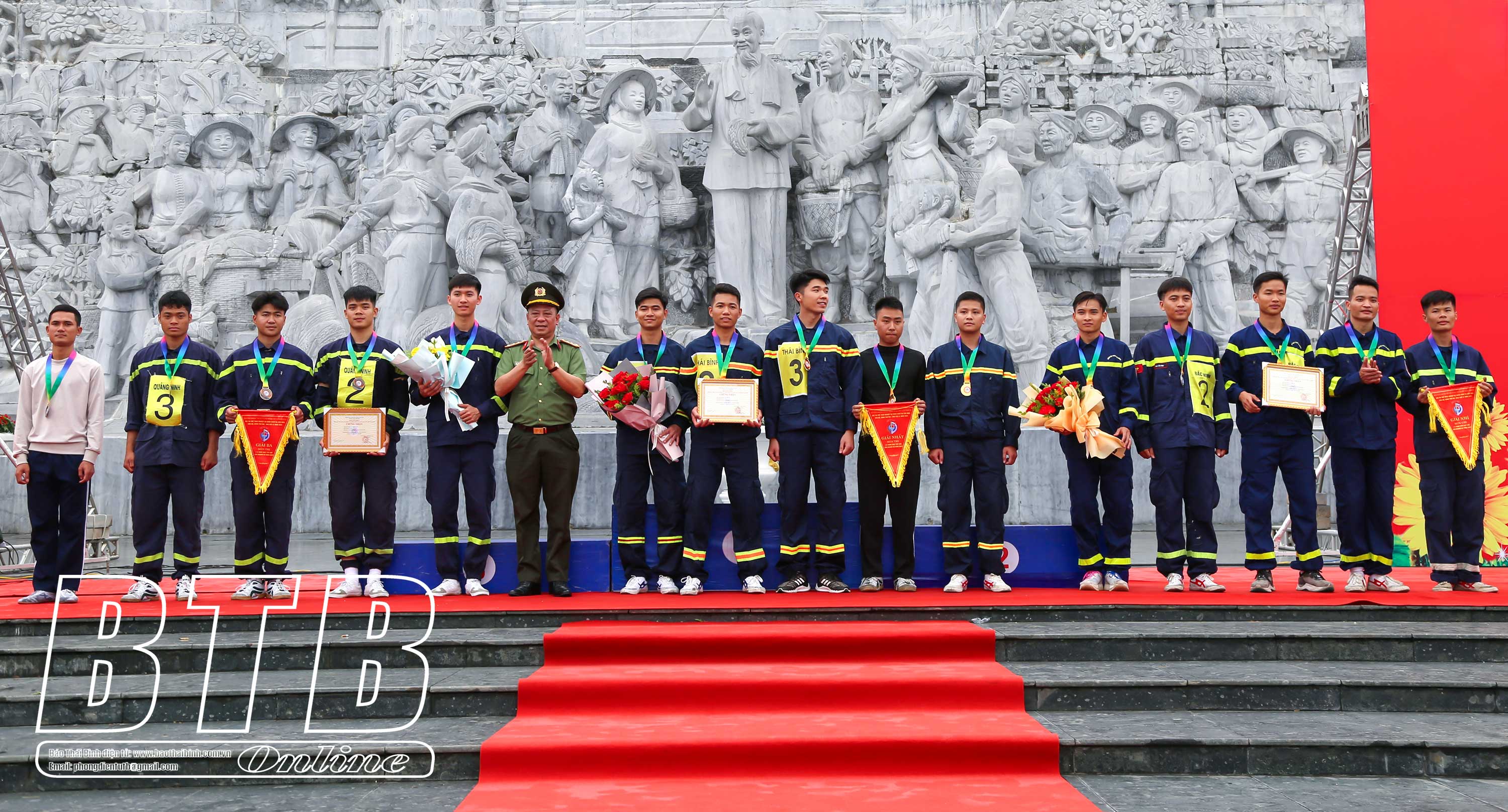 Đại tá Trần Xuân Ánh, Ủy viên Ban Thường vụ Tỉnh ủy, Giám đốc Công an tỉnh trao thưởng các đội đạt thành tích cao môn thi chạy tiếp sức cứu người và chữa cháy.