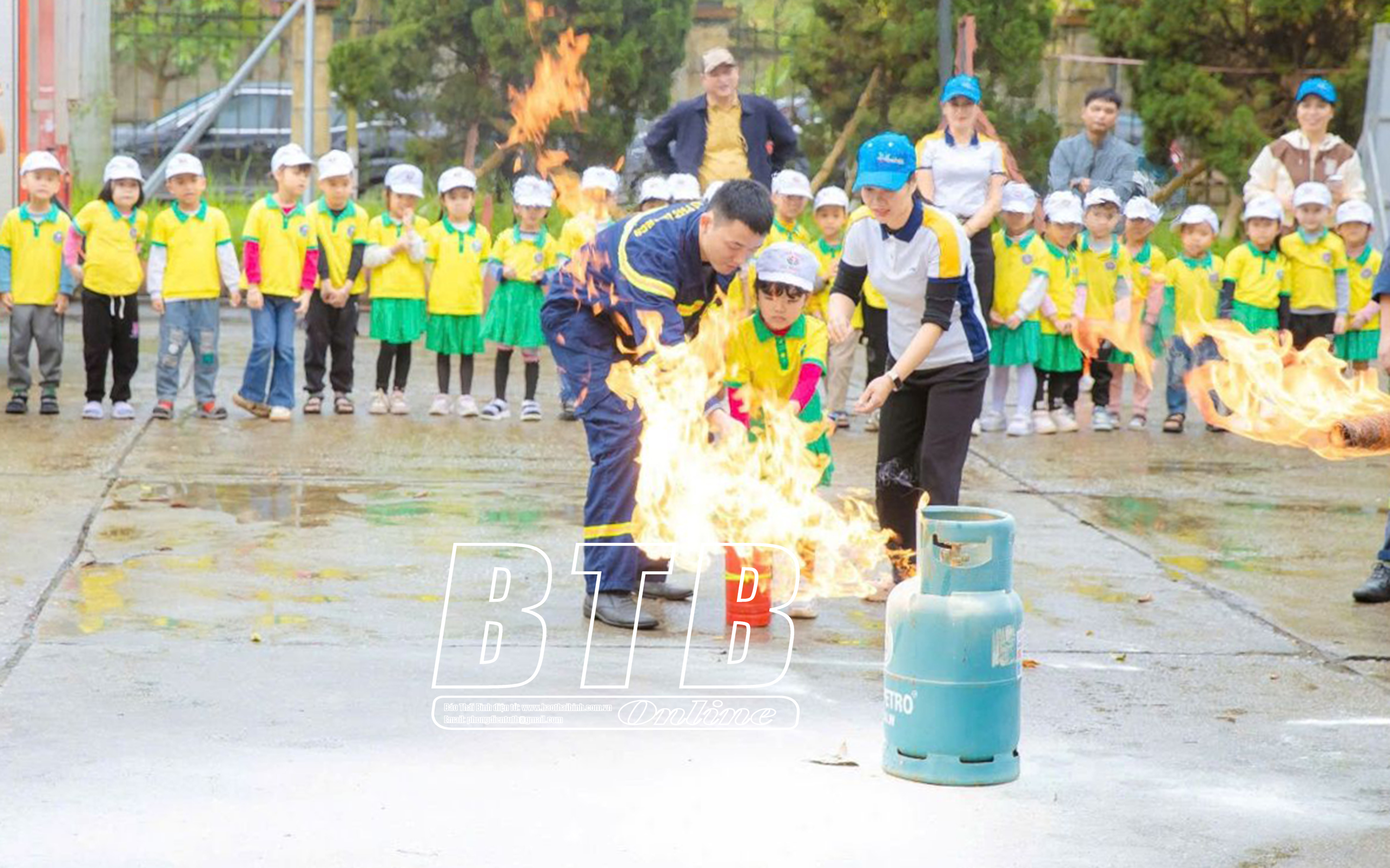 Cô và trò Trường Mầm non Vũ Phúc được hướng dẫn kỹ năng xử lý các tình huống cháy, nổ tại buổi học ngoại khóa.