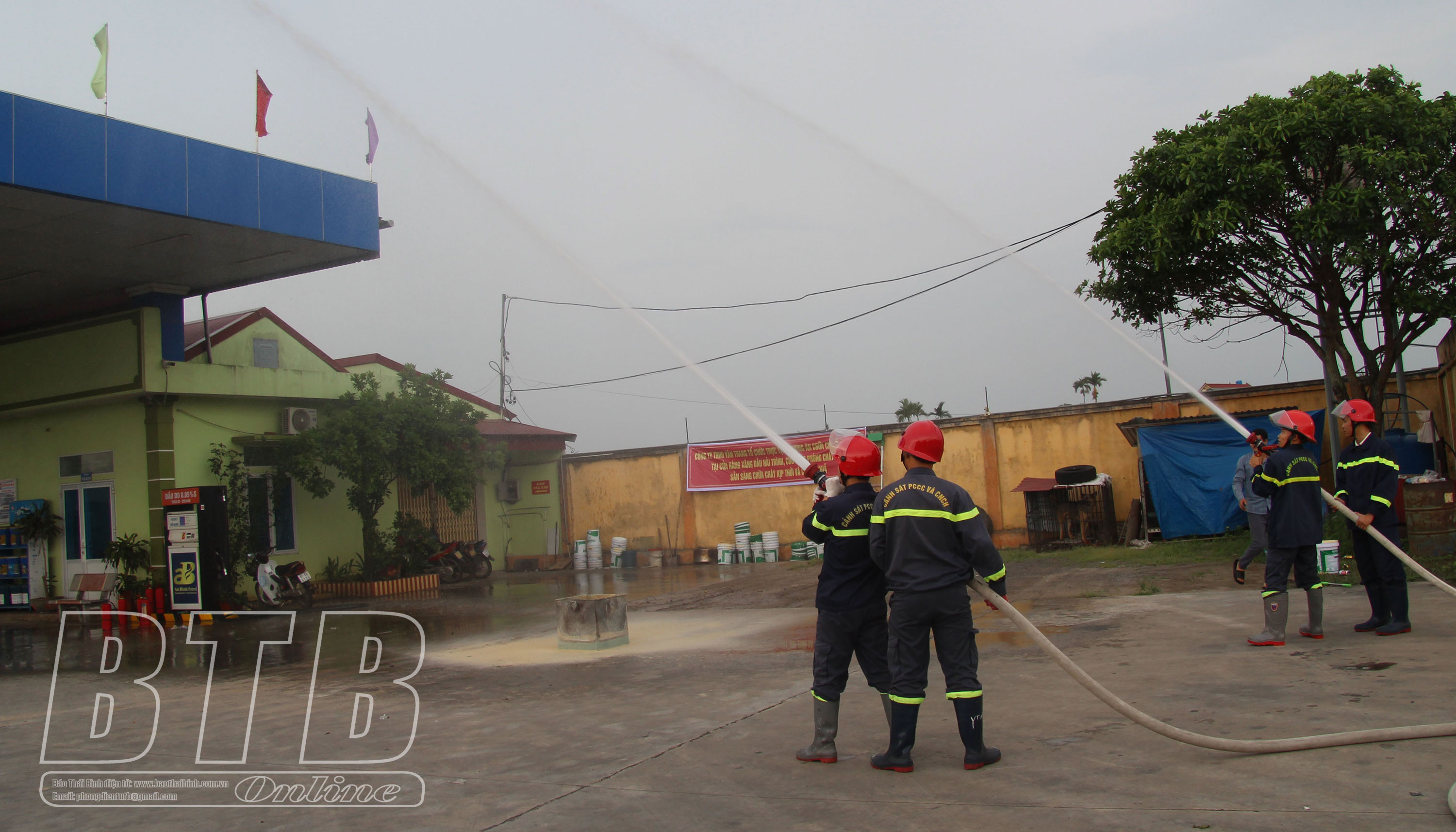 Với tình huống giả định: Vào hồi 14 giờ, 30 phút ngày 20/5/2025 xảy ra vụ cháy tại khu nhà văn phòng cửa hàng xăng dầu Hải Trình thuộc Công ty TNHH Vân Trang do chập điện. Chất cháy chủ yếu là bông, vải, sợi, nilon, bìa carton, hệ thống điện… Ngay sau khi phát hiện đám cháy, lực lượng chữa cháy cơ sở đã nhanh chóng triển khai các biện pháp xử lý ban đầu và phân công nhiệm vụ cụ thể cho từng bộ phận. Nhận định đám cháy có khả năng phát triển mạnh, lực lượng chữa cháy cơ sở đã liên lạc với Phòng Cảnh sát PCCC và CNCH, Công an tỉnh yêu cầu trợ giúp. Ngay sau khi nhận được tin báo, Phòng Cảnh sát PCCC và CNCH, Công an tỉnh phối hợp với Đội chữa cháy và CNCH khu vực huyện Hưng Hà huy động một xe chữa cháy cùng cán bộ chiến sĩ khẩn trương xuống hiện trường và triển khai đội hình thực hiện các biện pháp PCCC. Với tinh thần khẩn trương, nghiêm túc, các lực lượng tham gia diễn tập đã thực hành thuần thục các biện pháp xử lý khống chế, dập tắt hoàn toàn đám cháy.