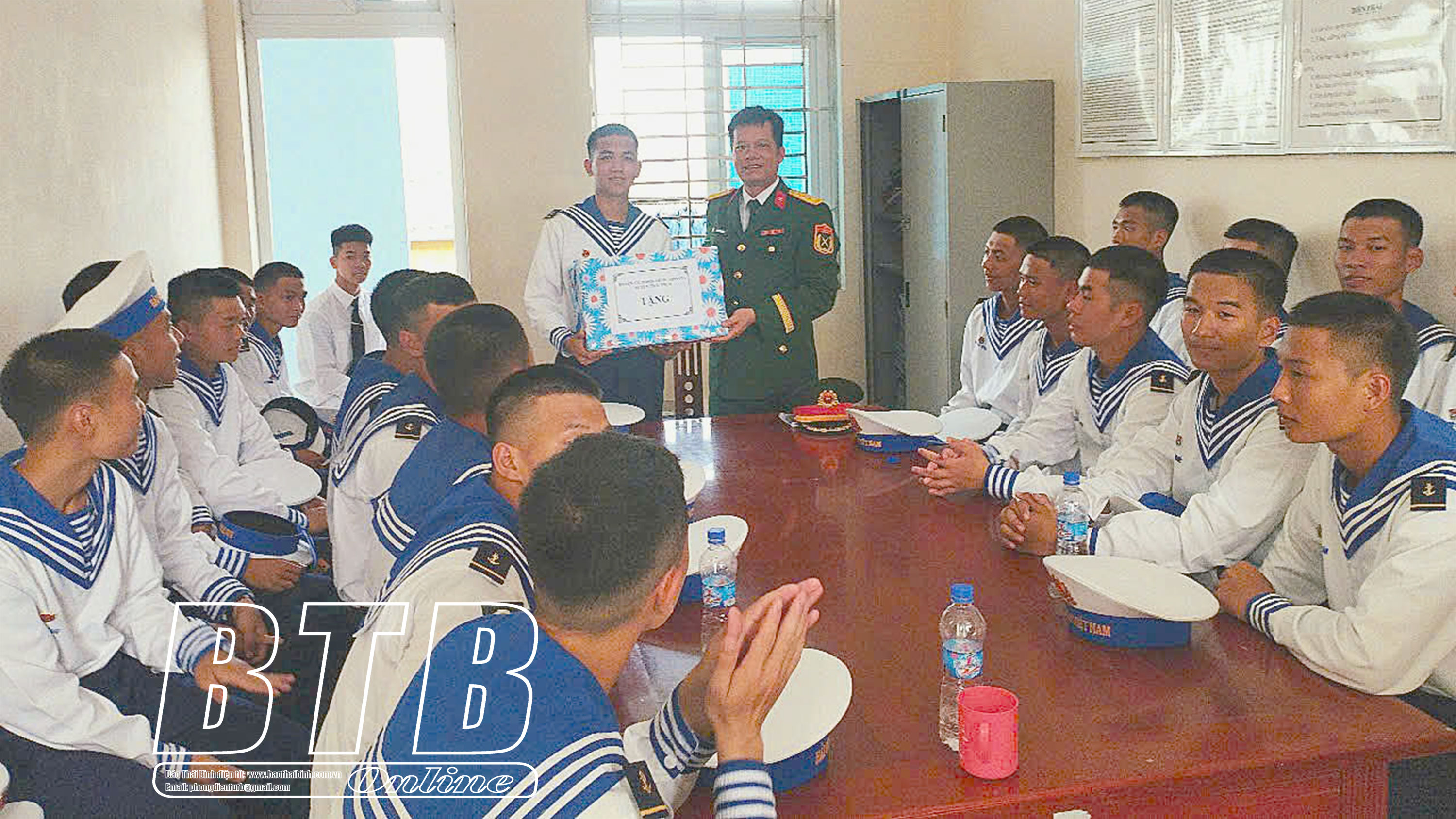Lãnh đạo Ban Chỉ huy Quân sự huyện Thái Thụy tặng quà chiến sĩ đang huấn luyện tại Tiểu đoàn 158, thuộc Lữ đoàn 147, Vùng 1 Hải quân.