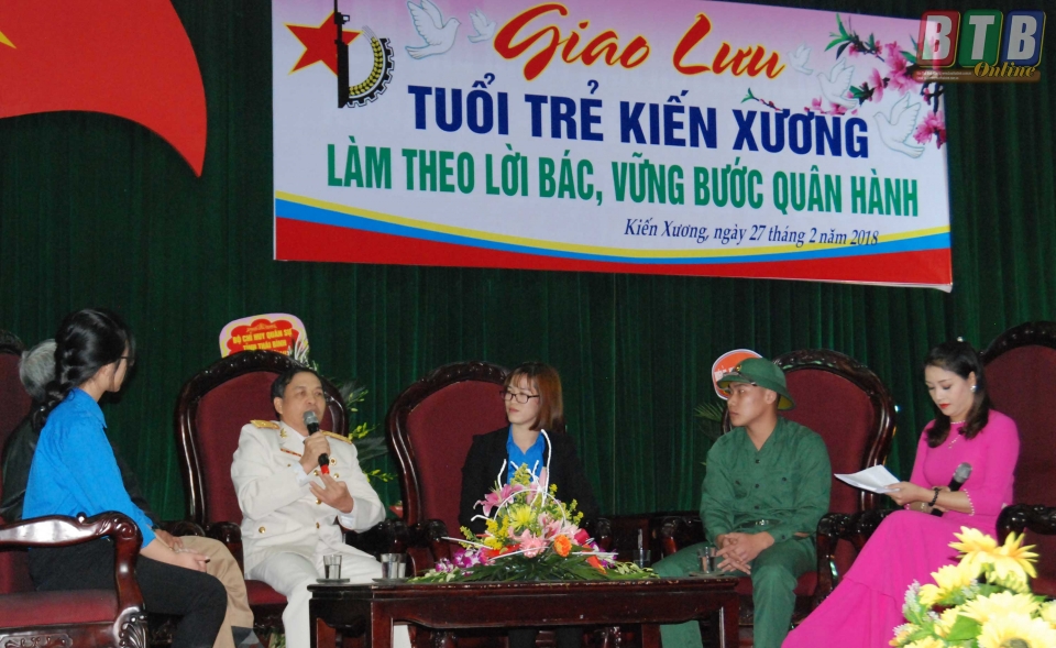 Với chủ đề "Tuổi trẻ Kiến Xương làm theo lời Bác, vững bước quân hành" các tân binh được giao lưu văn nghệ với các tiết mục hát, múa ca ngợi Đảng, quê hương, đất nước và người lính; đồng thời được nghe các CCB chia sẻ về truyền thống anh hùng cách mạng của các thế hệ cha anh trong cuộc kháng chiến chống Pháp, chống Mỹ giải phóng dân tộc, thống nhất đất nước và làm nhiệm vụ quốc tế cao cả. Nghe chia sẻ của đại diện ĐoànThanh niên, học sinh, thân nhân tân binh và tân binh về lý tưởng sống, trách nhiệm thanh niên trong nhiệm vụ xây dựng và bảo vệ Tổ quốc.