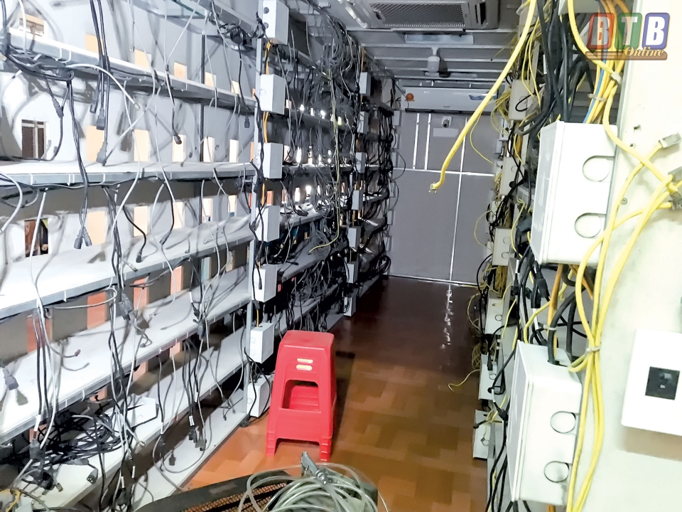 Anh Đ. X. Q ở xã Đông Cường (Đông Hưng) dẫn chúng tôi vào ngôi nhà chừng trên 100m2 được làm cách âm, chống nóng, lắp giàn điều hòa công suất lớn, chỉ cách đây 3 tuần nơi đây là xưởng đào Bitcoin quy mô lớn với hơn 200 máy “trâu cày” hoạt động suốt ngày đêm. Tuy nhiên, hiện giờ khung cảnh tan hoang, toàn bộ máy “trâu cày” đã được di dời, chỉ còn trơ lại các đầu dây nối internet, phích điện, ổ cắm chằng chịt và một tấm biển hiệu công ty được tháo xuống.