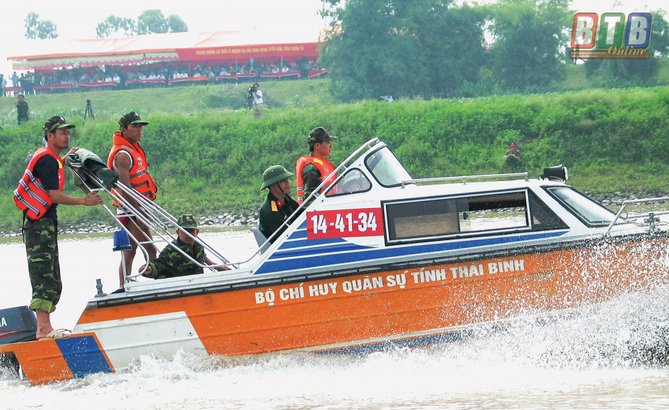 Theo đồng chí Phó Chỉ huy trưởng, Tham mưu trưởng Bộ CHQS tỉnh: Bơi và chạy vũ trang không chỉ rèn luyện thể lực mà còn rèn luyện kỹ năng khi tham gia phòng, chống thiên tai và tìm kiếm cứu nạn (PCTT và TKCN). Thực hiện tốt 2 nội dung này cũng là bước đệm quan trọng, nâng cao tính chủ động của LLVT tỉnh khi mùa mưa bão đã đến. LLVT tỉnh luôn xác định nhiệm vụ PCTT và TKCN cũng chính là nhiệm vụ tác chiến thời bình của người lính Cụ Hồ. Giữa tháng 7/2018, sự cố sạt lở tại tuyến đê biển số 5 đoạn qua địa phận xã Nam Phú (Tiền Hải) là một bài học kinh nghiệm trong công tác phối hợp, hiệp đồng giữa các lực lượng và công tác huy động lực lượng xử lý sự cố. Đây là tuyến đê trọng yếu, bảo vệ tính mạng và tài sản cho hàng chục nghìn hộ dân của huyện Tiền Hải và các địa phương khác. Sau khi phát hiện sạt lở, Bộ CHQS tỉnh đã tham mưu cho Ban Chỉ huy PCTT và TKCN tỉnh cử 110 cán bộ, chiến sĩ, 15 phương tiện ô tô và dụng cụ cầm tay, phối hợp với 170 cán bộ, chiến sĩ Trung đoàn 8 (Sư đoàn 395), 80 cán bộ, chiến sĩ Bộ Chỉ huy Bộ đội Biên phòng tỉnh phối hợp tham gia xử lý hơn 800m đê bị sạt, trượt và chính việc gia cố thành công đã bảo vệ an toàn thân đê.