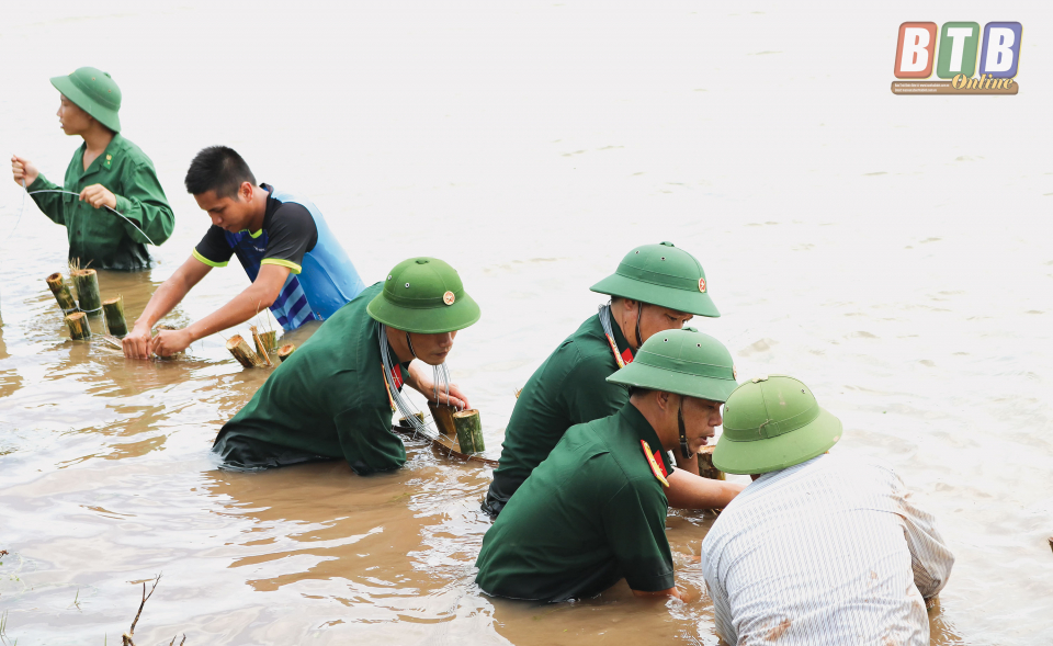 Cán bộ, chiến sĩ lực lượng vũ trang huyện Tiền Hải phối hợp gia cố tuyến đê biển số 5 đoạn qua xã Nam Phú.