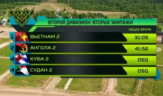 Đội xếp thứ hai trong bảng đấu hôm qua là Angola 2 với kết quả 41 phút 52 giây. Đội Cuba 2, đối thủ xếp thứ nhất trong vòng thi đấu hôm 5/8, hôm qua bị loại do làm cháy động cơ xe thi đấu và xe dự phòng vì kíp lái quên không mở cửa xả nước khi thực hiện phần thi vượt sông cạn. Đội Sudan 2 cũng bị loại với lý do tương tự.