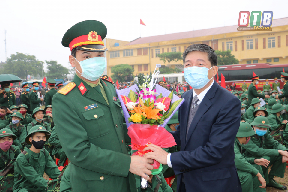 Tại buổi lễ, đồng chí Chủ nhiệm Ủy ban Kiểm tra Tỉnh ủy cùng lãnh đạo các cơ quan, đơn của tỉnh, Quân khu 3 và huyện Kiến Xương tặng hoa chúc mừng đơn vị nhận quân và động viên các tân binh lên đường nhập ngũ.