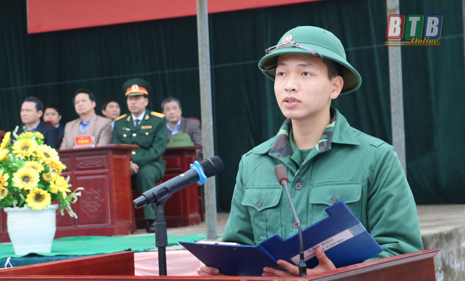 Đại diện 350 tân binh huyện Kiến Xương lên đường nhập ngũ năm 2020 phát biểu quyết tâm ra sức phấn đấu học tập, rèn luyện, hoàn thành xuất sắc nhiệm vụ trong thời gian tại ngũ, cống hiến sức trẻ cho sự nghiệp xây dựng và bảo vệ Tổ quốc.