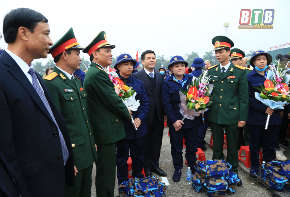 Lãnh đạo Bộ Quốc phòng, Quân khu 3, lãnh đạo tỉnh, thành phố Thái Bình tặng hoa động viên tân binh lên đường nhập ngũ. Ảnh: Thành Tâm
