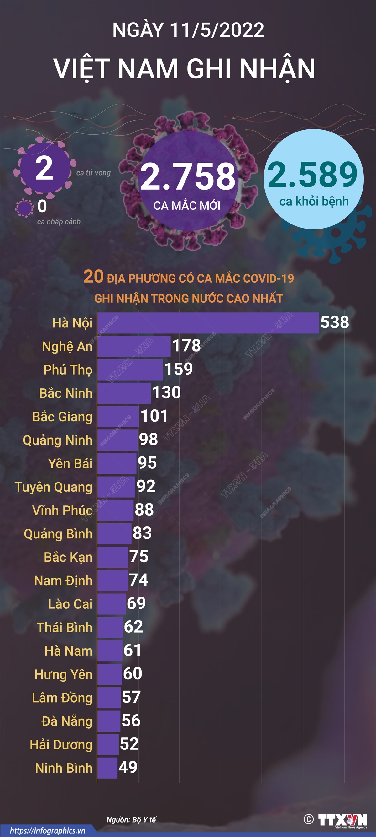 Theo Bộ Y tế, tính từ 16h ngày 10/5 đến 16h ngày 11/5/2022, Việt Nam ghi nhận 2.758 ca mắc mới COVID-19 tại 53 tỉnh, thành phố, 2 ca tử vong do COVID-19.