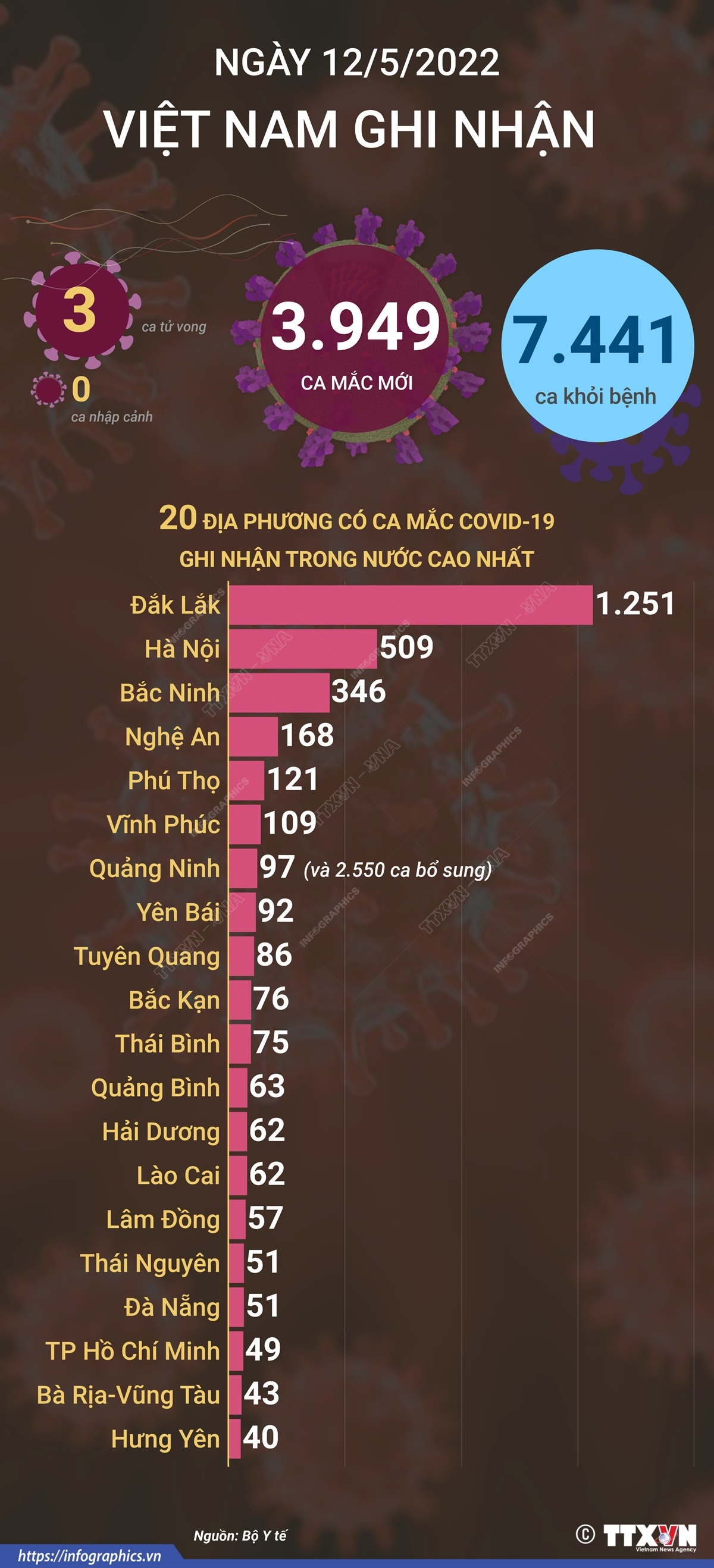 Theo Bộ Y tế, tính từ 16h ngày 11/5 đến 16h ngày 12/5/2022, Việt Nam ghi nhận 3.949 ca mắc mới COVID-19 tại 55 tỉnh, thành phố