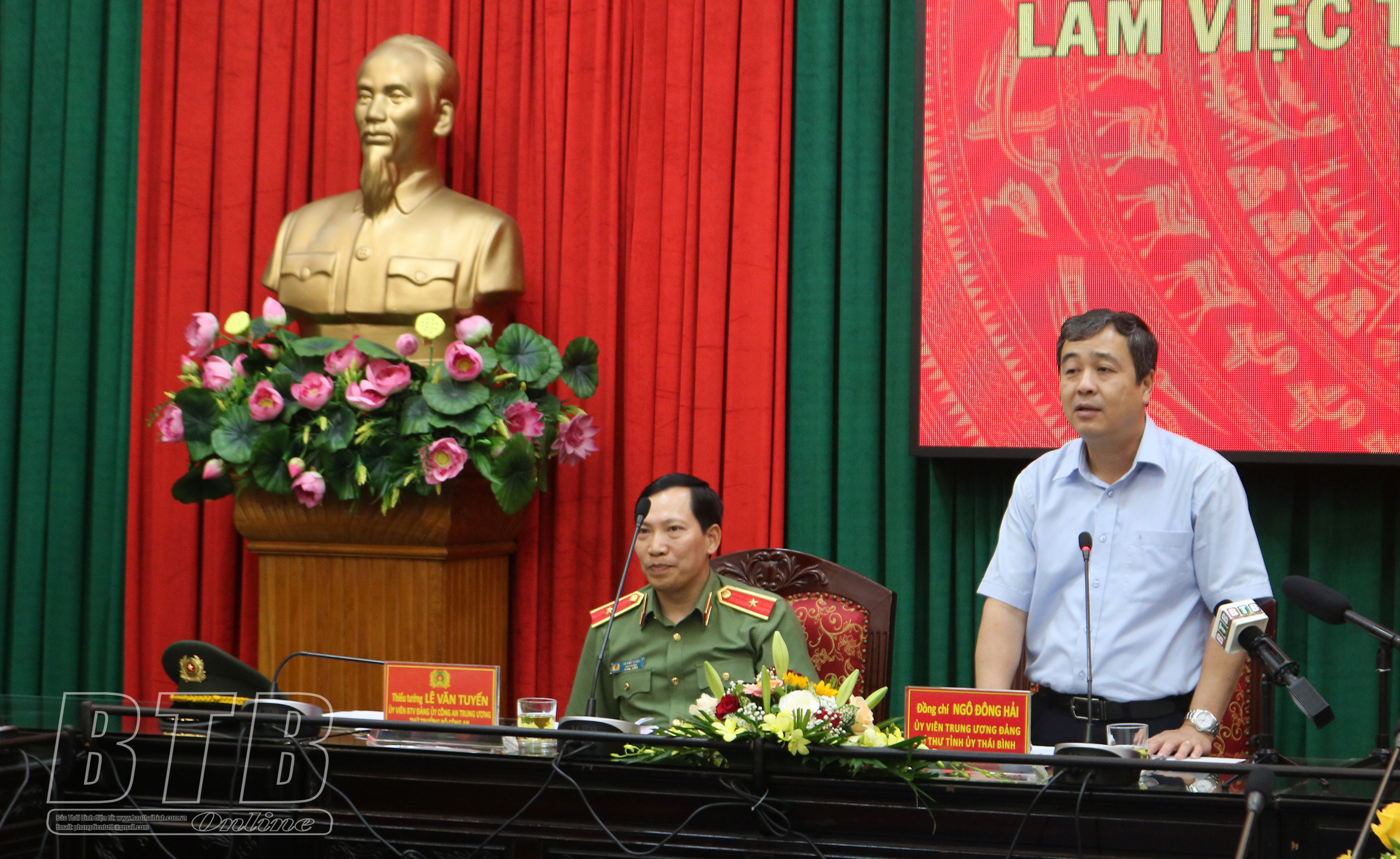 Phát biểu tại buổi làm việc, đồng chí Ngô Đông Hải, Ủy viên Ban Chấp hành Trung ương Đảng, Bí thư Tỉnh ủy nhấn mạnh, tỉnh Thái Bình đã nỗ lực đẩy mạnh các giải pháp  phát triển kinh tế - xã hội, thu hút đầu tư vào Khu kinh tế Thái Bình và các khu, cụm công nghiệp trên địa bàn tỉnh. Để thực hiện được các mục tiêu trong phát triển kinh tế - xã hội đòi hỏi sự đoàn kết, nỗ lực của các cấp, ngành, các đơn vị, địa phương, trong đó có lực lượng Công an tỉnh. Góp phần vào những kết quả chung đó, Công an tỉnh đã nỗ lực triển khai nhiều giải pháp hiệu quả, bảo đảm an ninh chính trị, trật tự an toàn xã hội trên địa bàn tỉnh. Lãnh đạo tỉnh cùng các cấp, các ngành, các đơn vị, địa phương luôn phối hợp và tạo mọi điều kiện thuận lợi nhất để lực lượng công an thực hiện hiệu quả các nhiệm vụ được giao.