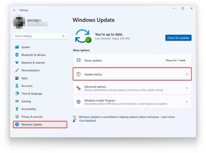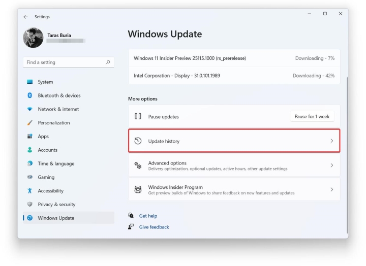 2. Từ giao diện Settings, theo đường dẫn Windows Update > Update History.