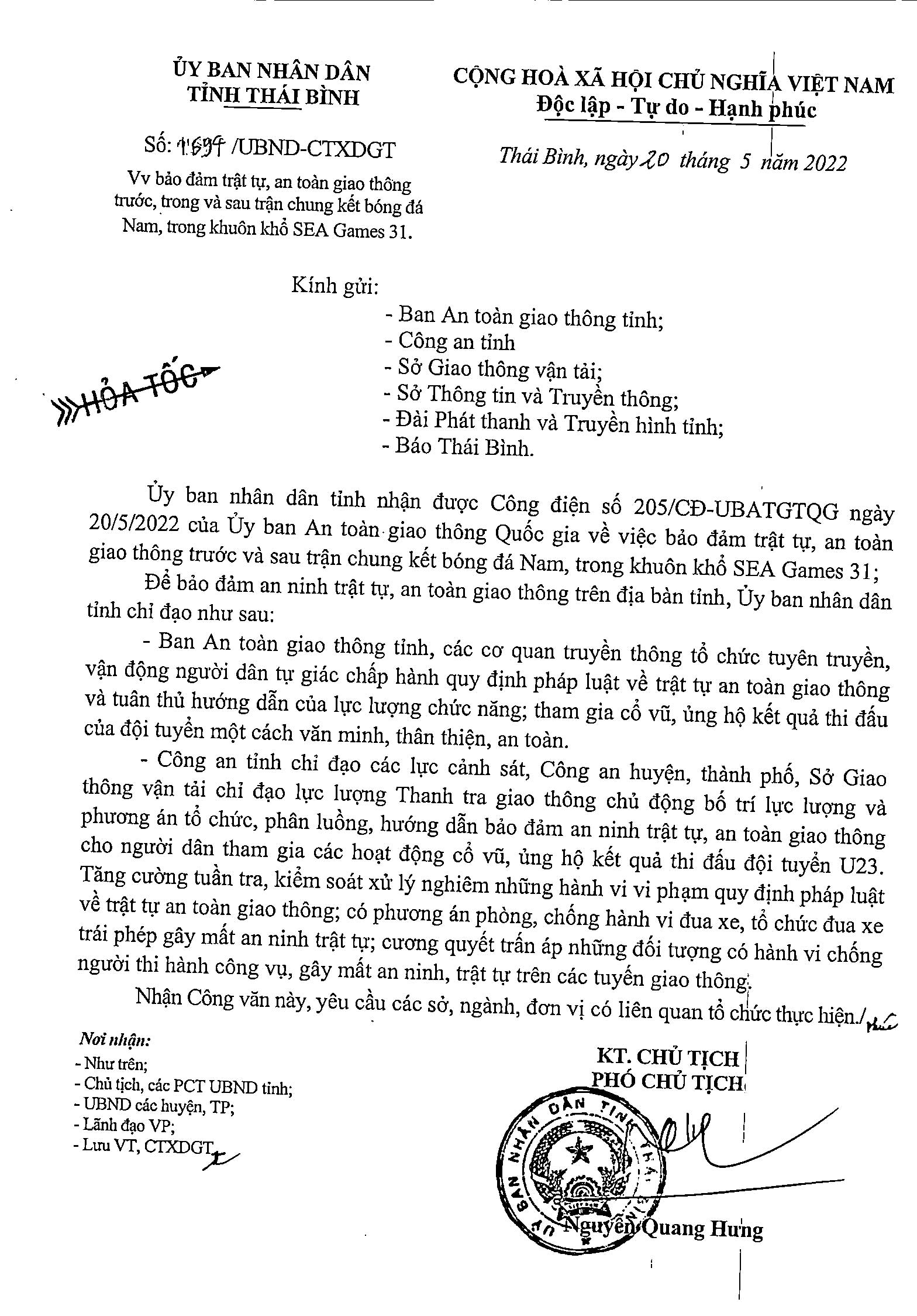 Công văn số 1694/UBND-CTXDGT của Ủy ban nhân dân tỉnh về việc bảo đảm trật tự ,an toàn giao thông trước, trong và sau trận chung kết bóng đá Nam, trong khuôn khổ SEA Gammes 31.