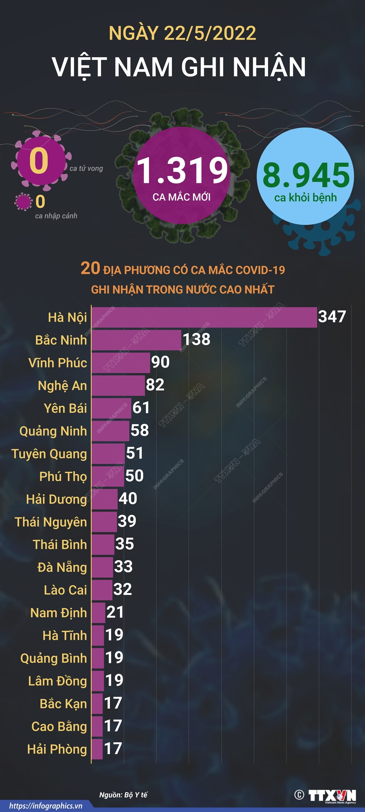 Theo Bộ Y tế, tính từ 16h ngày 21/5 đến 16h ngày 22/5/2022, Việt Nam ghi nhận 1.319 ca mắc mới COVID-19 tại 42 tỉnh, thành phố, 0 ca tử vong do COVID-19. Hà Nội ghi nhận 347 ca, Bắc Ninh 138 ca, Vĩnh Phúc 90 ca, Nghệ An 82 ca, Yên Bái 61 ca, Quảng Ninh 58 ca, Tuyên Quang 51 ca, Phú Thọ 50 ca, Hải Dương 40 ca, Thái Nguyên 39 ca, Thái Bình 35 ca, Đà Nẵng 33 ca… 8.945 ca được công bố khỏi bệnh.