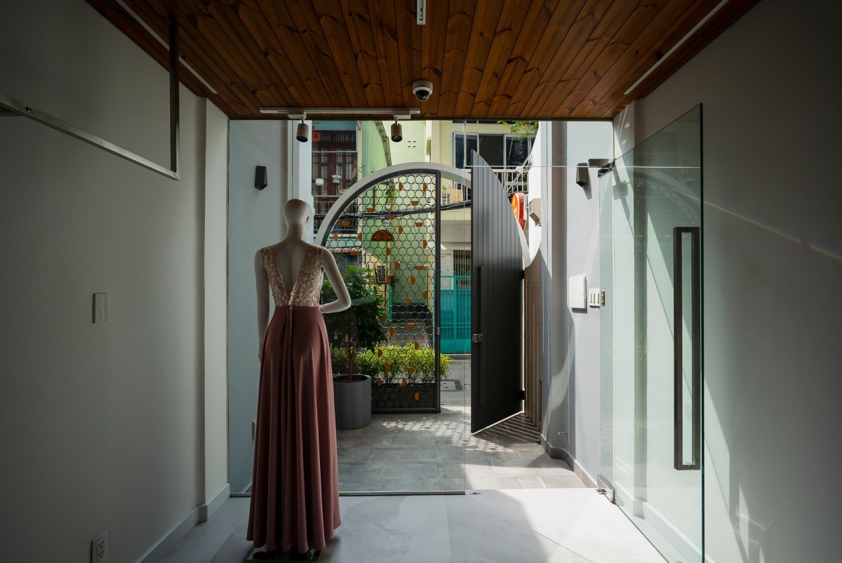 Tầng một là tiệm may đồ của người em gái, phía trước có một khoảng sân để đỗ xe và làm khoảng đệm cho công trình.