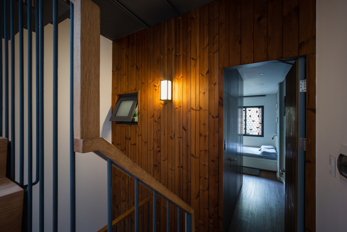 Ở tầng hai, phòng ngủ của con gái gia chủ được bọc trong khối gỗ màu nâu đỏ. Tầng này lùi vào so với các tầng trên, khiến người đứng dưới sảnh tầng một có cảm giác không gian cao, thoáng hơn thực tế. Khối gỗ "lơ lửng" cũng thu hút sự chú ý của người đi đường.