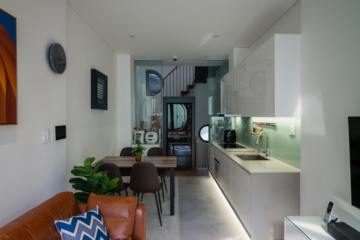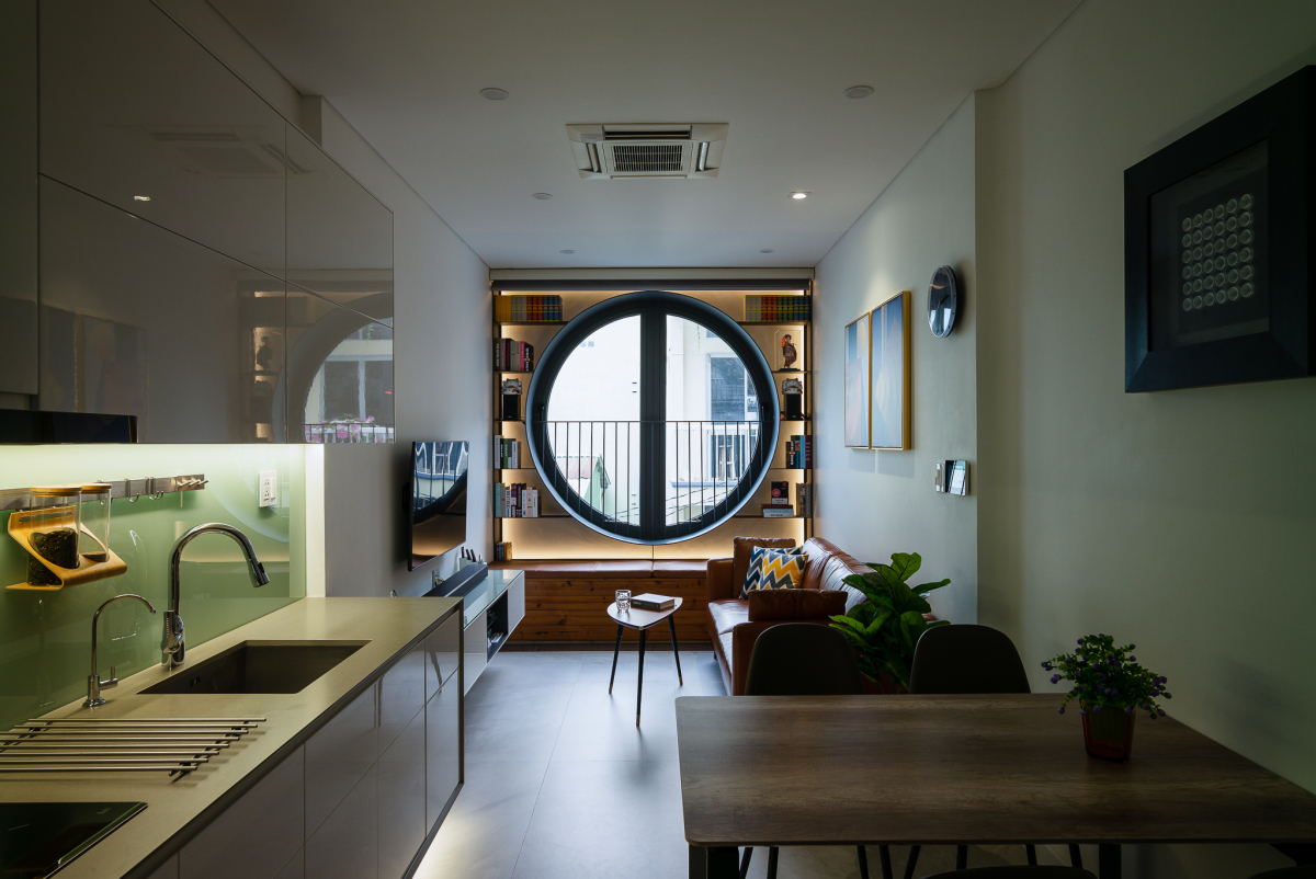 Phòng khách, bếp và phòng ăn thông nhau.