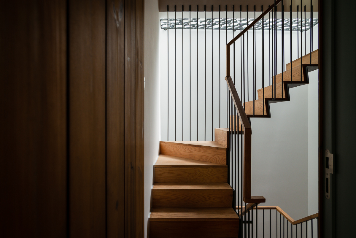 Cầu thang chữ U chuyển dần thành cầu thang tròn cho phù hợp với công năng các tầng đồng thời thay đổi cảm giác của người ở khi di chuyển. Điểm cuối của con đường này là cửa sổ mái kính hình bán nguyệt với đầy ánh sáng tự nhiên.