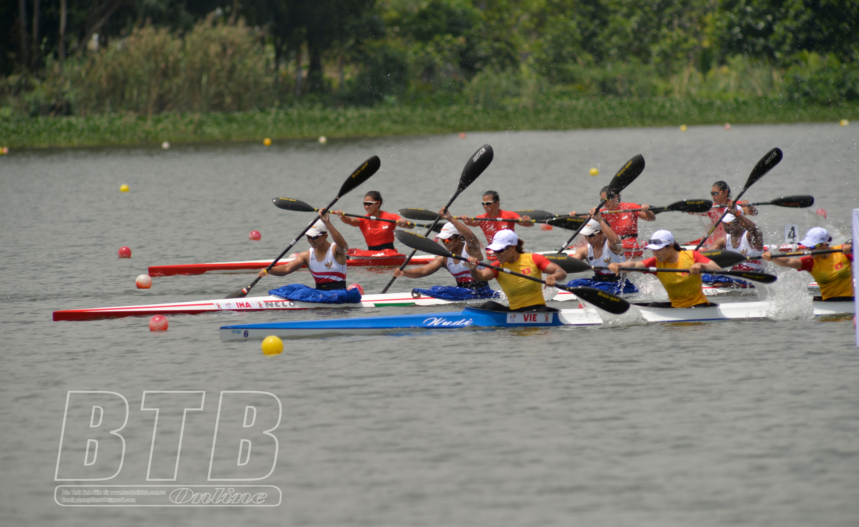 VĐV Nguyễn Thị Thanh Mai của Thái Bình cùng các đồng đội đạt huy chương bạc ở nội dung thi đấu đua thuyền canoeing.