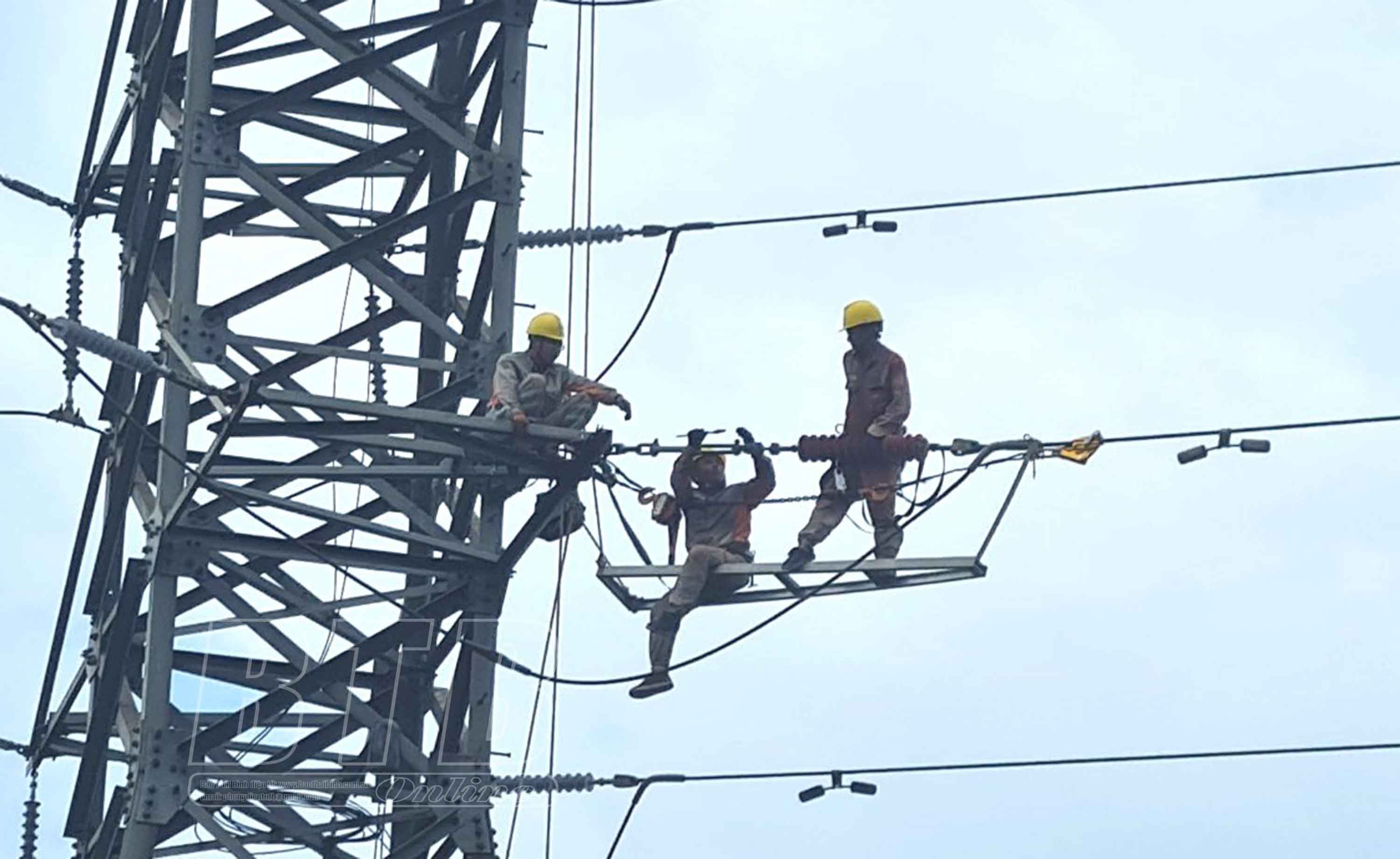 Các công nhân Công ty Điện lực nỗ lực sửa chữa đường dây 110kV bảo đảm truyền tải điện an toàn.