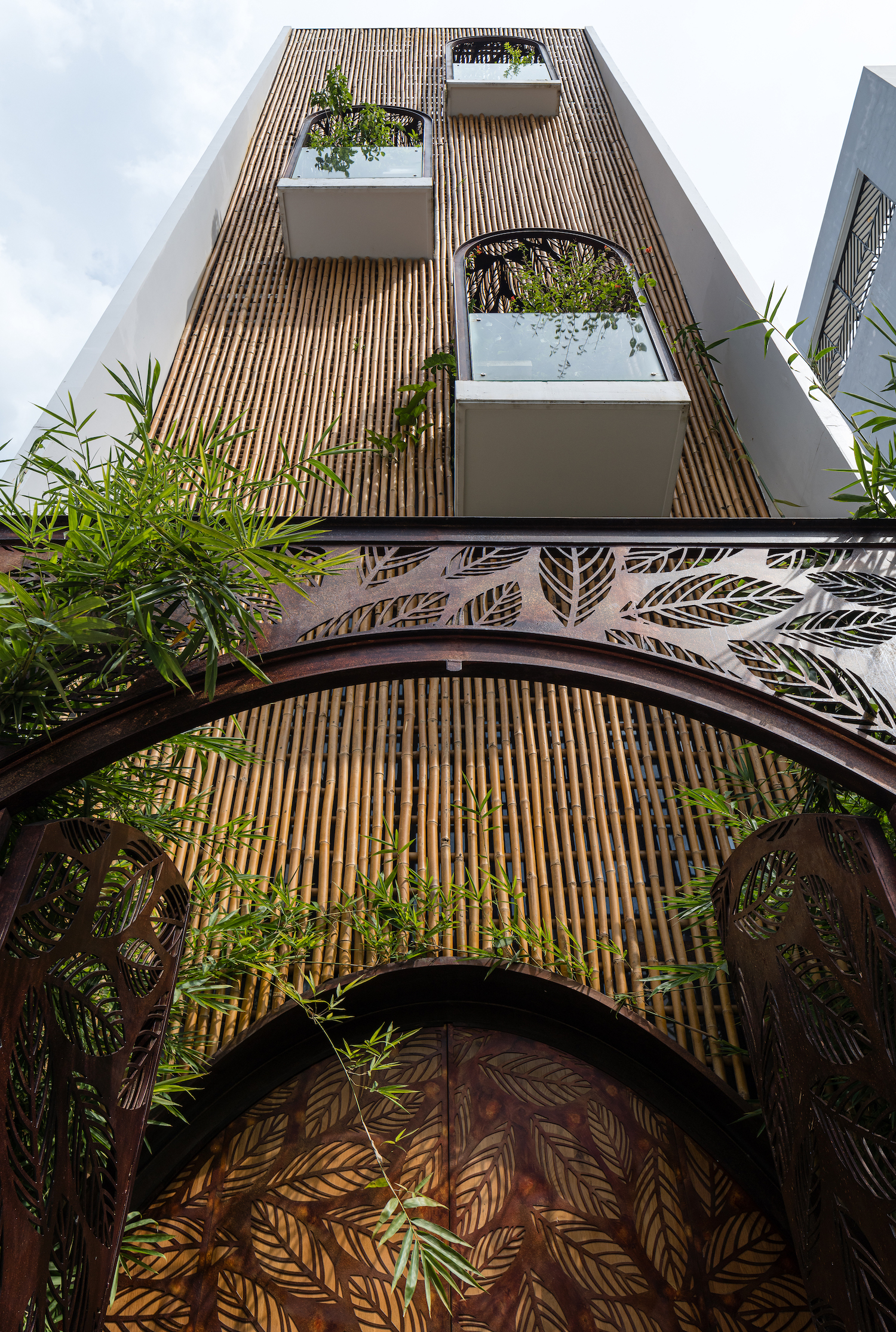 Mặt tiền nhà gây ấn tượng với vỏ tre và cổng sắt cắt hình lá cây.