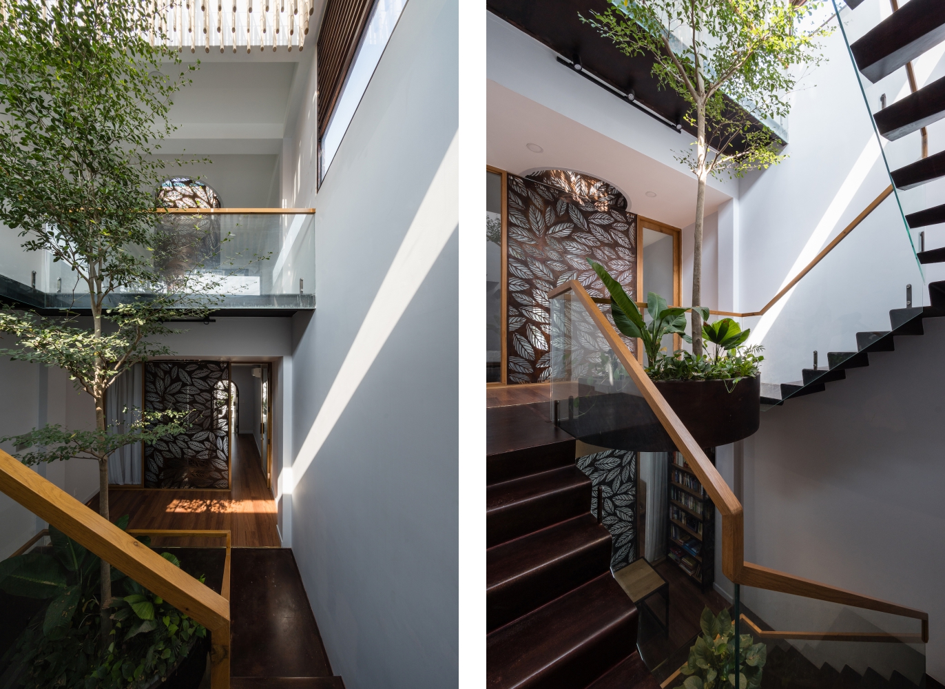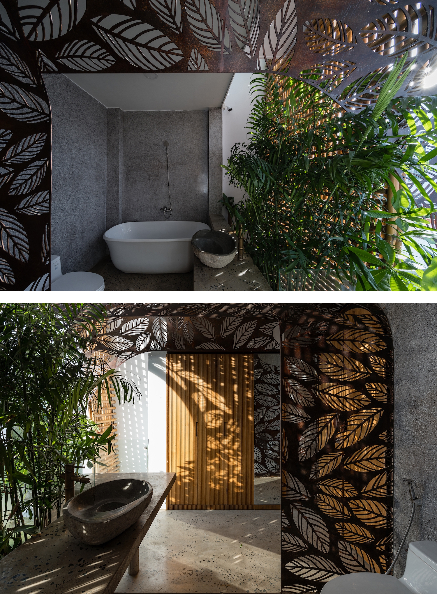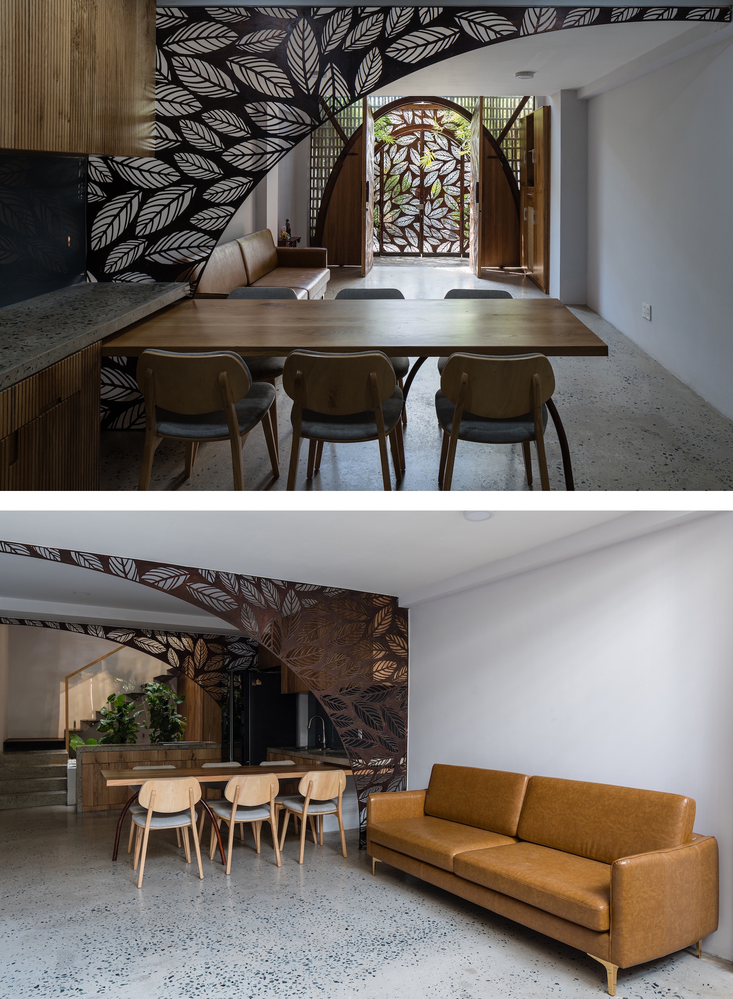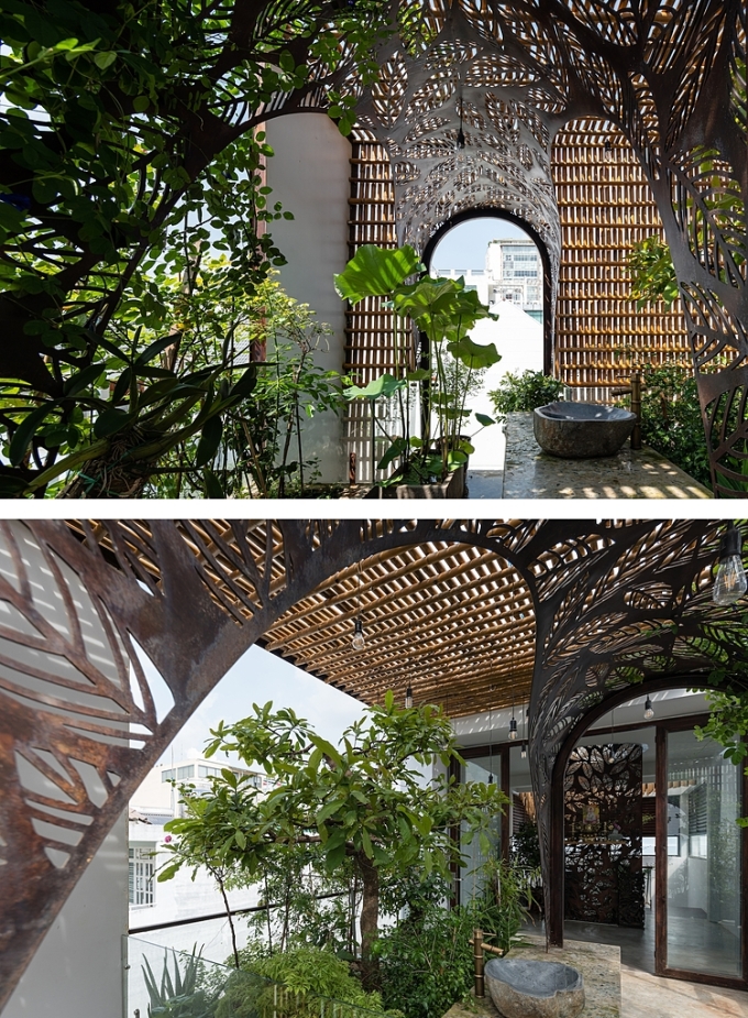 Các vách ngăn bằng sắt cắt hình lá cây có vai trò lấy sáng, đối lưu không khí và được dùng như những tấm bình phong cách điệu. Sắt cắt hình lá cây còn làm vòm che nắng ở trên các ban công và cổng vào, đem tới cảm giác về không gian mở và kết nối.