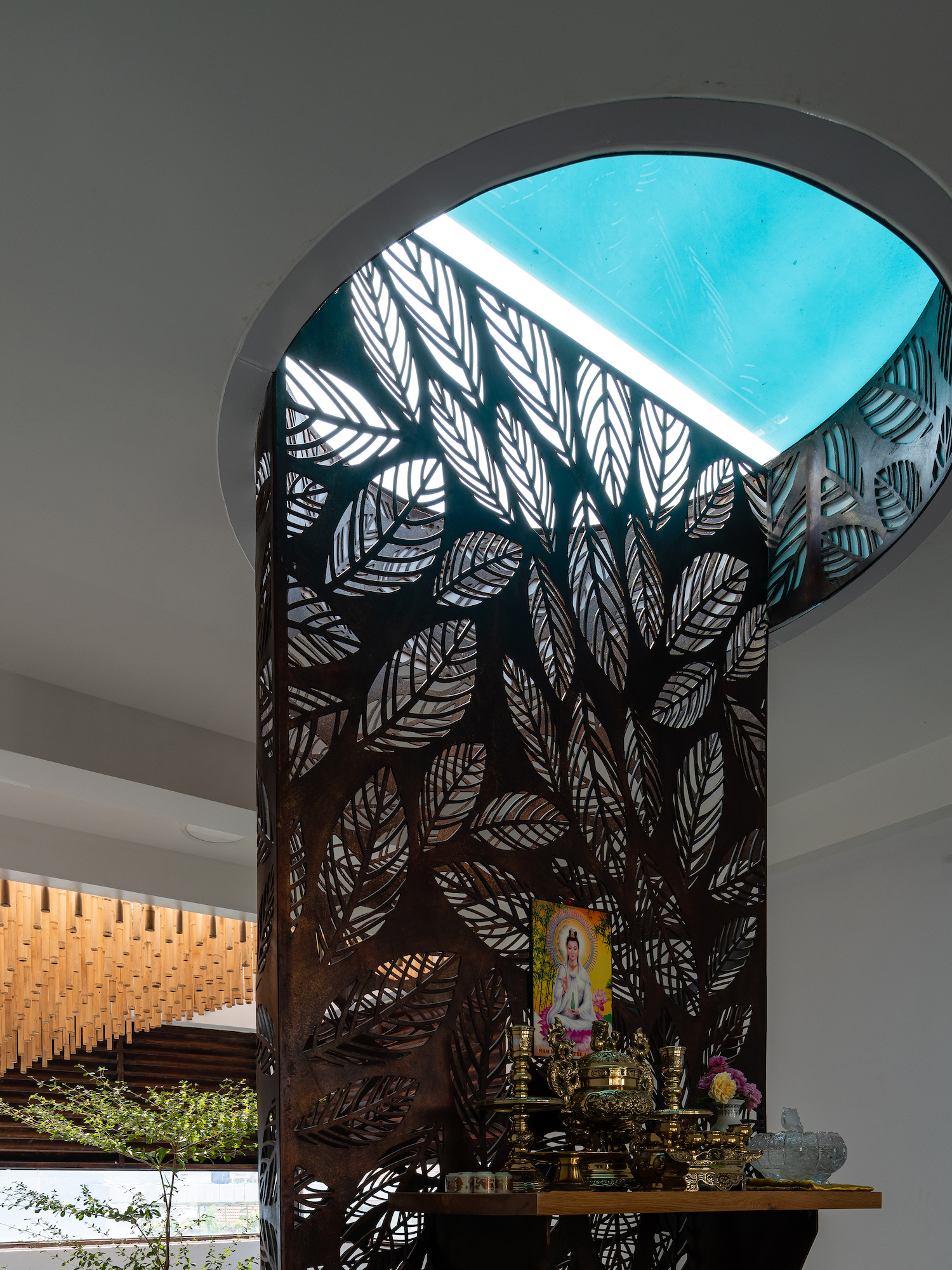 Các vách ngăn bằng sắt cắt hình lá cây có vai trò lấy sáng, đối lưu không khí và được dùng như những tấm bình phong cách điệu.