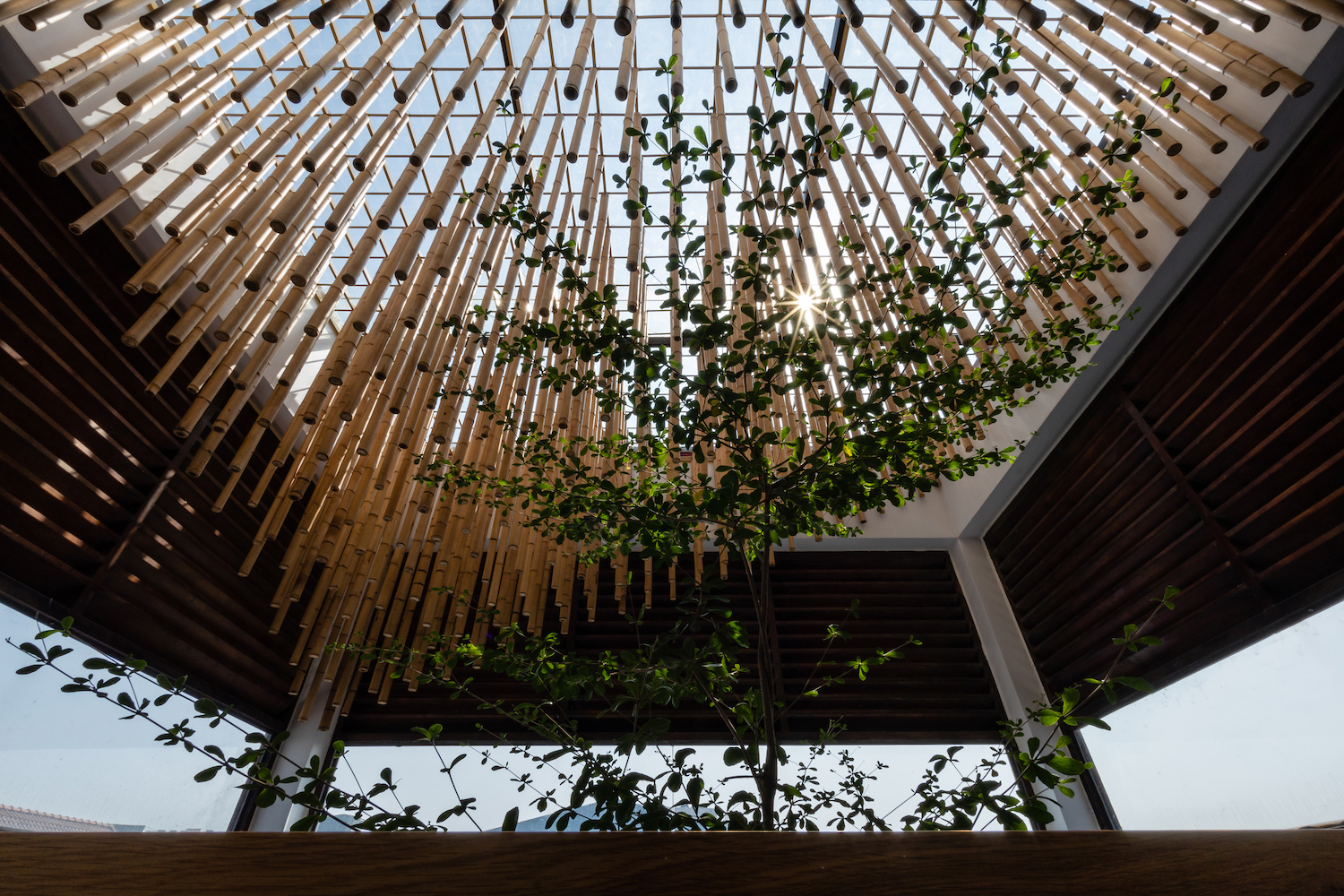 Trần tre ở giếng trời sân sau được làm từ những thanh tre treo dọc, vừa để ánh sáng lọt qua, tạo nên những bóng nắng thú vị và âm thanh như chuông gió khi có gió thổi.