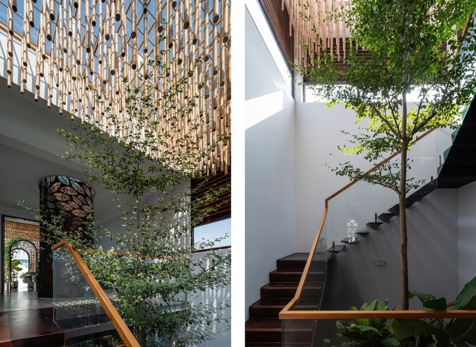 Bên cạnh những khoảng trống, cây xanh trở thành ranh giới giữa bên trong với bên ngoài nhà và giữa các không gian chức năng. Nhờ đó, không gian nối tiếp không đứt gãy và được tiếp xúc với thiên nhiên.