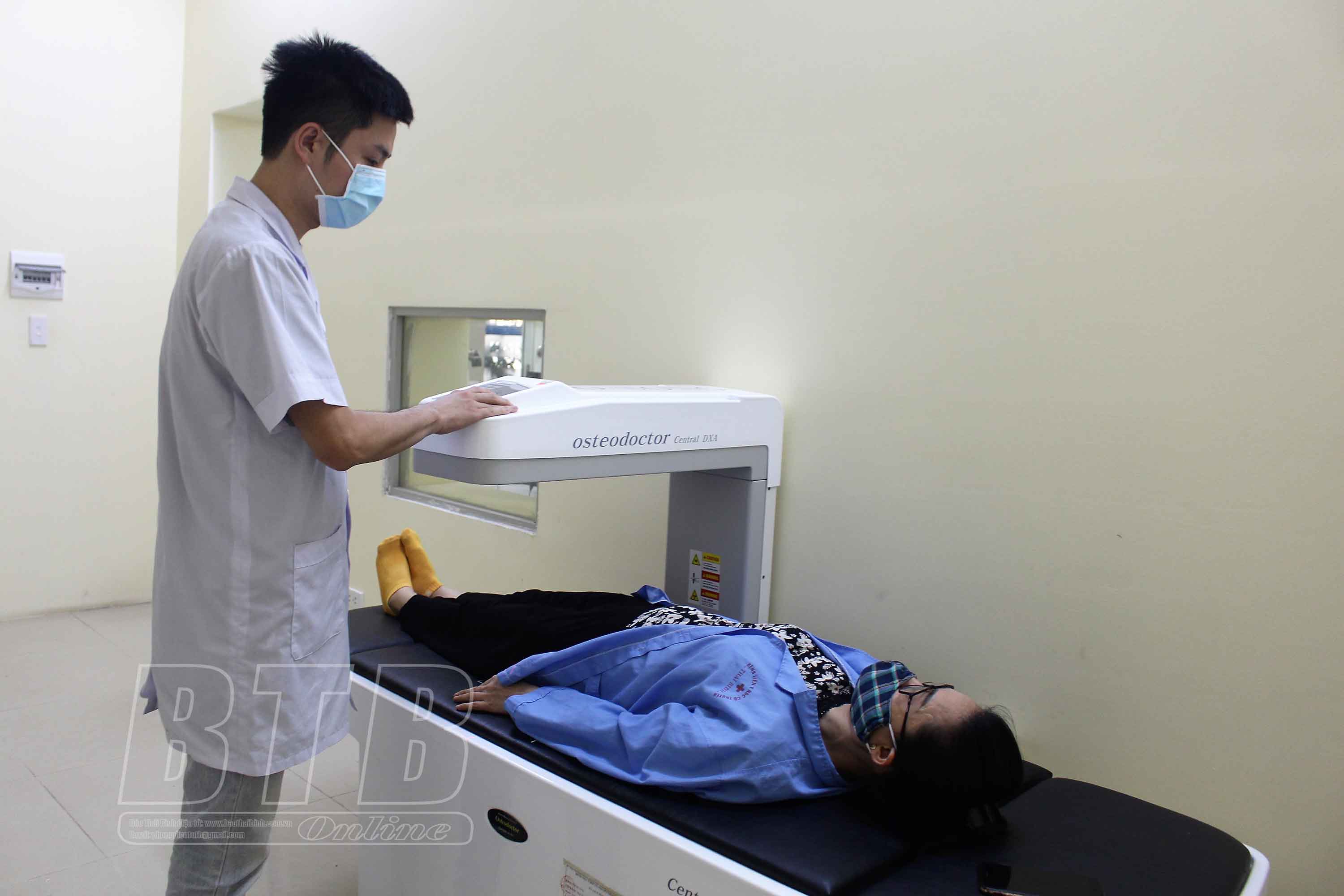 Nhân viên y tế Bệnh viện Y học cổ truyền Thái Bình sử dụng máy đo độ loãng xương khám cho người bệnh.