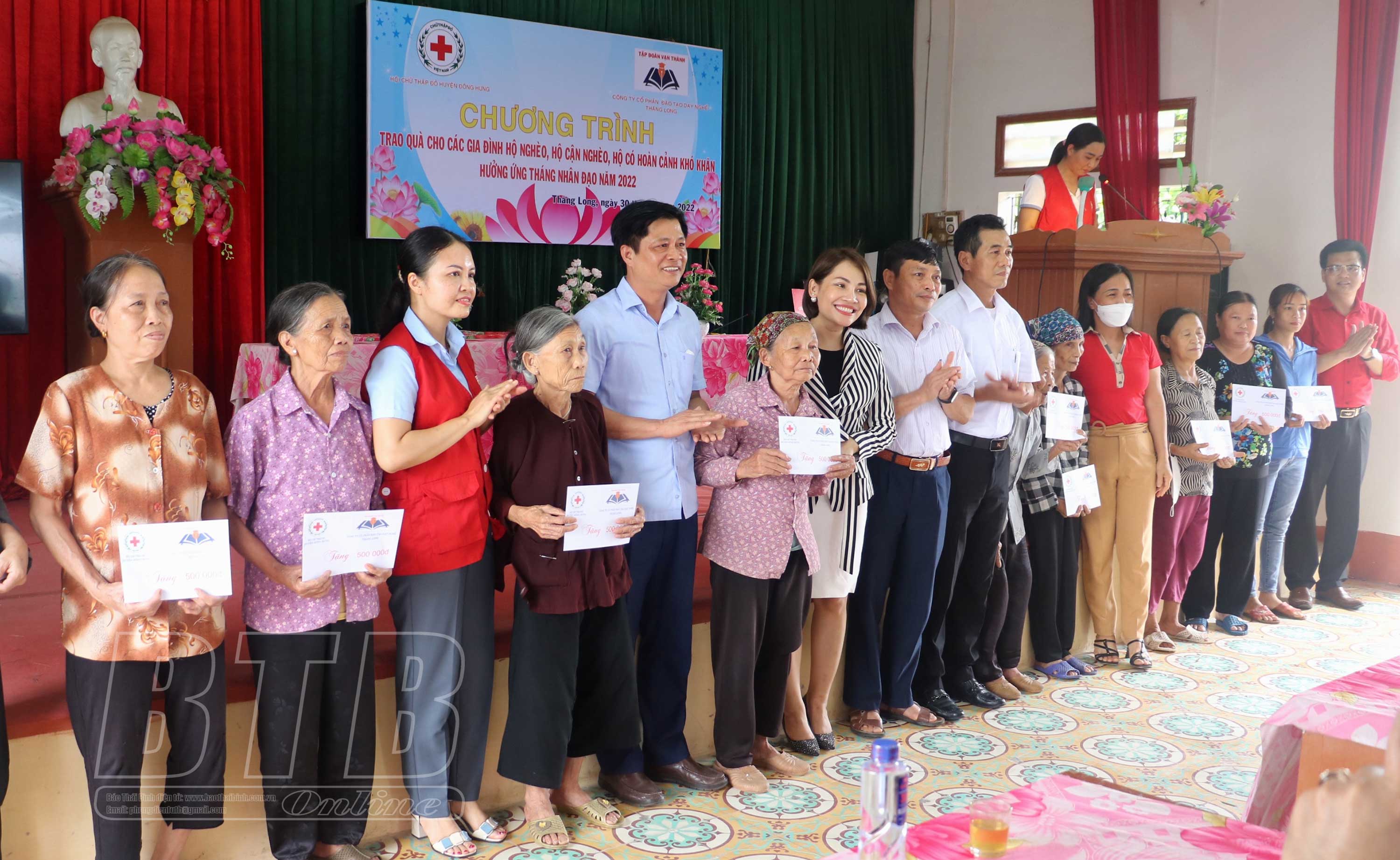 Hưởng ứng tháng nhân đạo năm 2022, chiều ngày 30/5, Hội Chữ thập đỏ huyện Đông Hưng phối hợp với Công ty Cổ phần Đào tạo dạy nghề Thăng Long (Tập đoàn Vạn Thành) tổ chức trao quà cho 100 gia đình thuộc hộ nghèo, cận nghèo, hộ có hoàn cảnh khó khăn trên địa bàn xã Thăng Long.