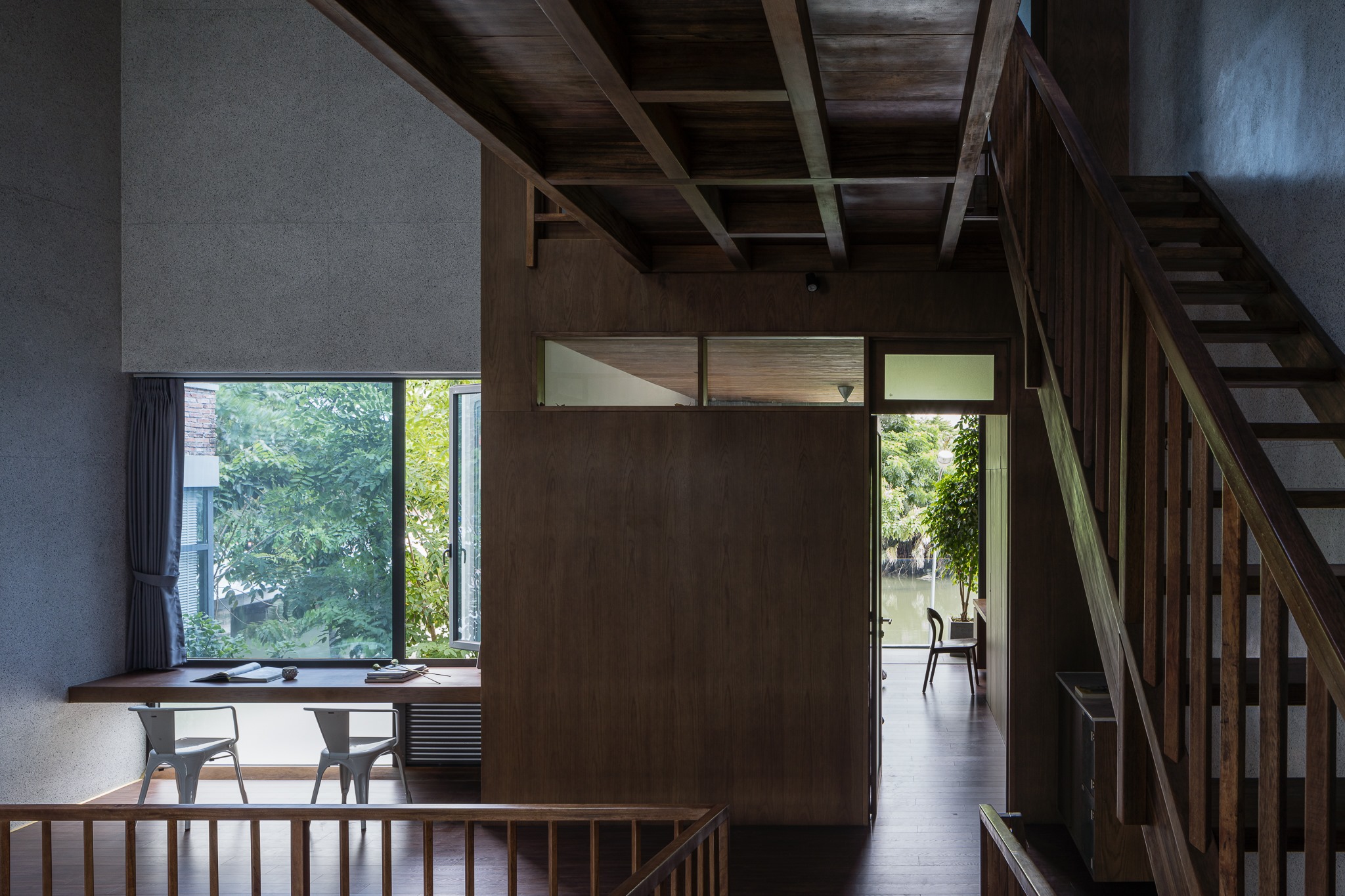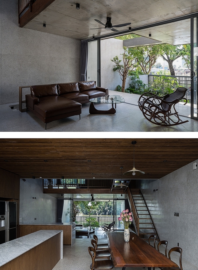 Các khu vực chức năng được bố trí trước và sau giếng trời. Nhờ thủ pháp giật cấp sàn và hệ thang gỗ lệch tầng, phòng ở đằng sau không bị phòng ở đằng trước chắn tầm nhìn. Mọi phòng ngủ cũng như phòng khách, bếp đều được trang bị cửa kính lớn để có thể ngắm trọn "view" sông trước nhà.