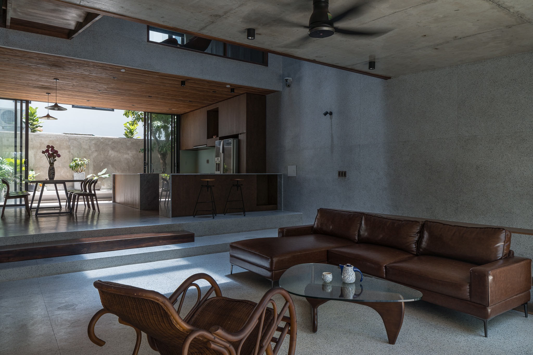 Bếp nằm phía sau phòng khách. Sự thay đổi về chiều cao tạo nên ranh giới giữa các không gian chức năng.