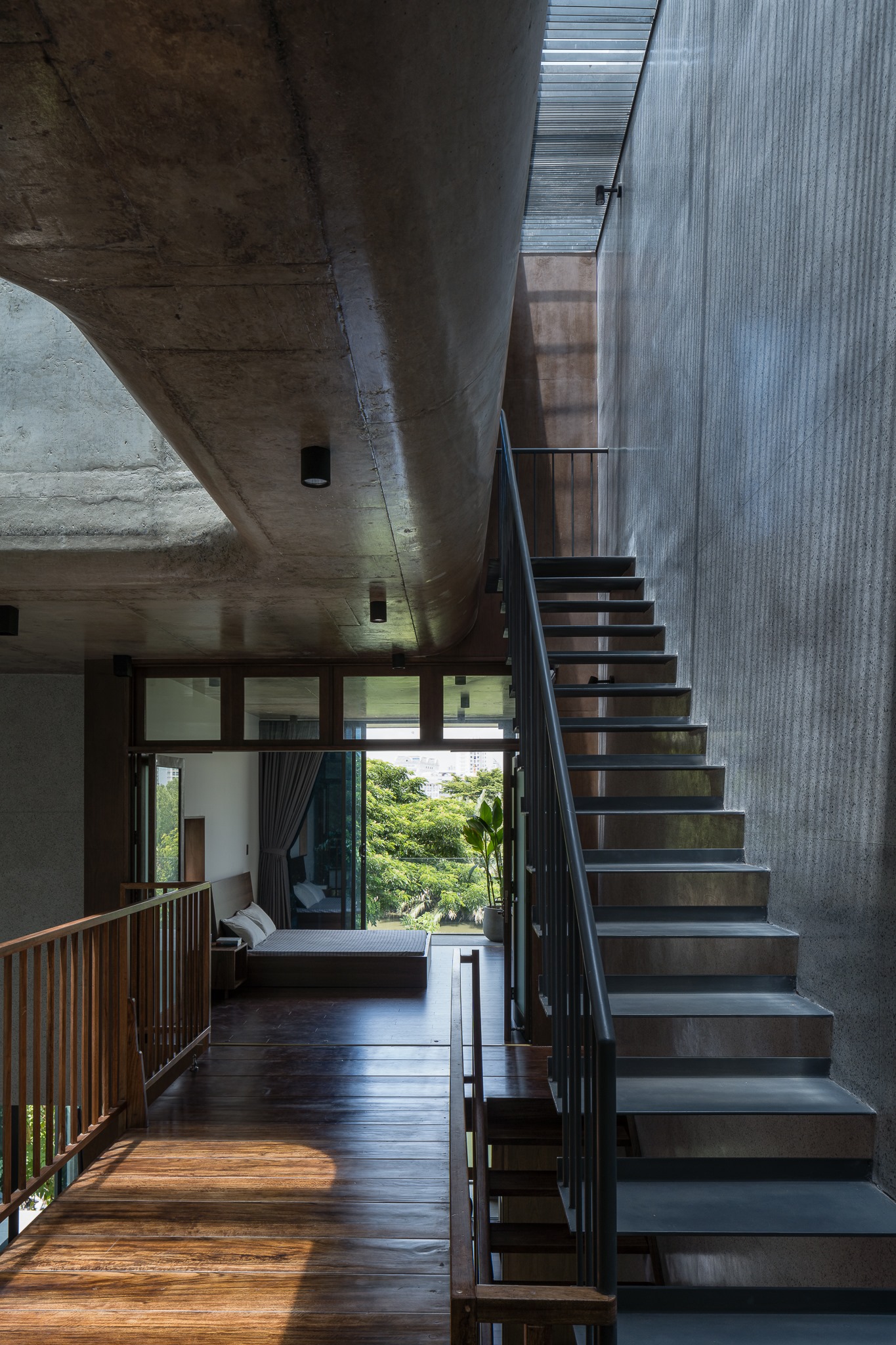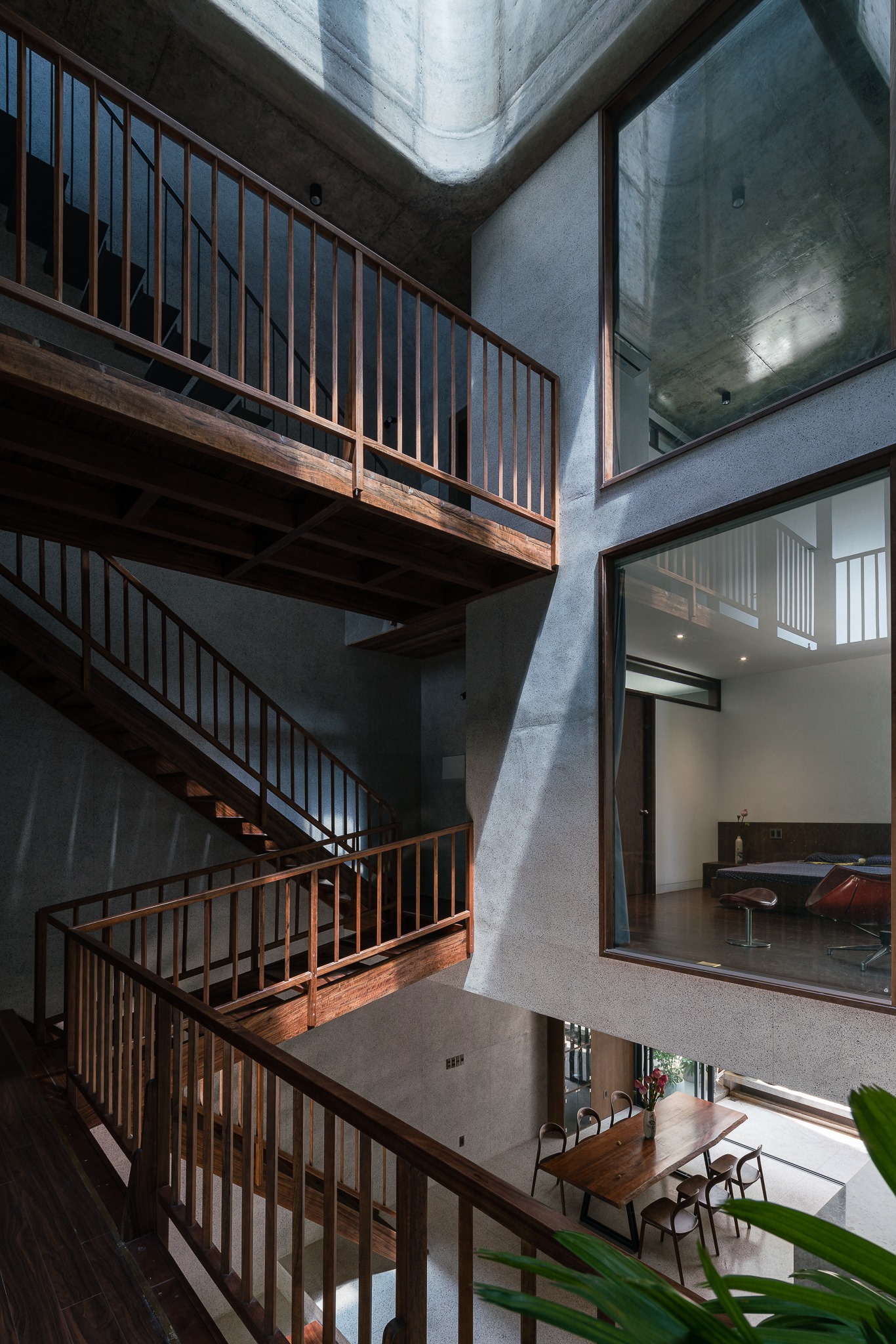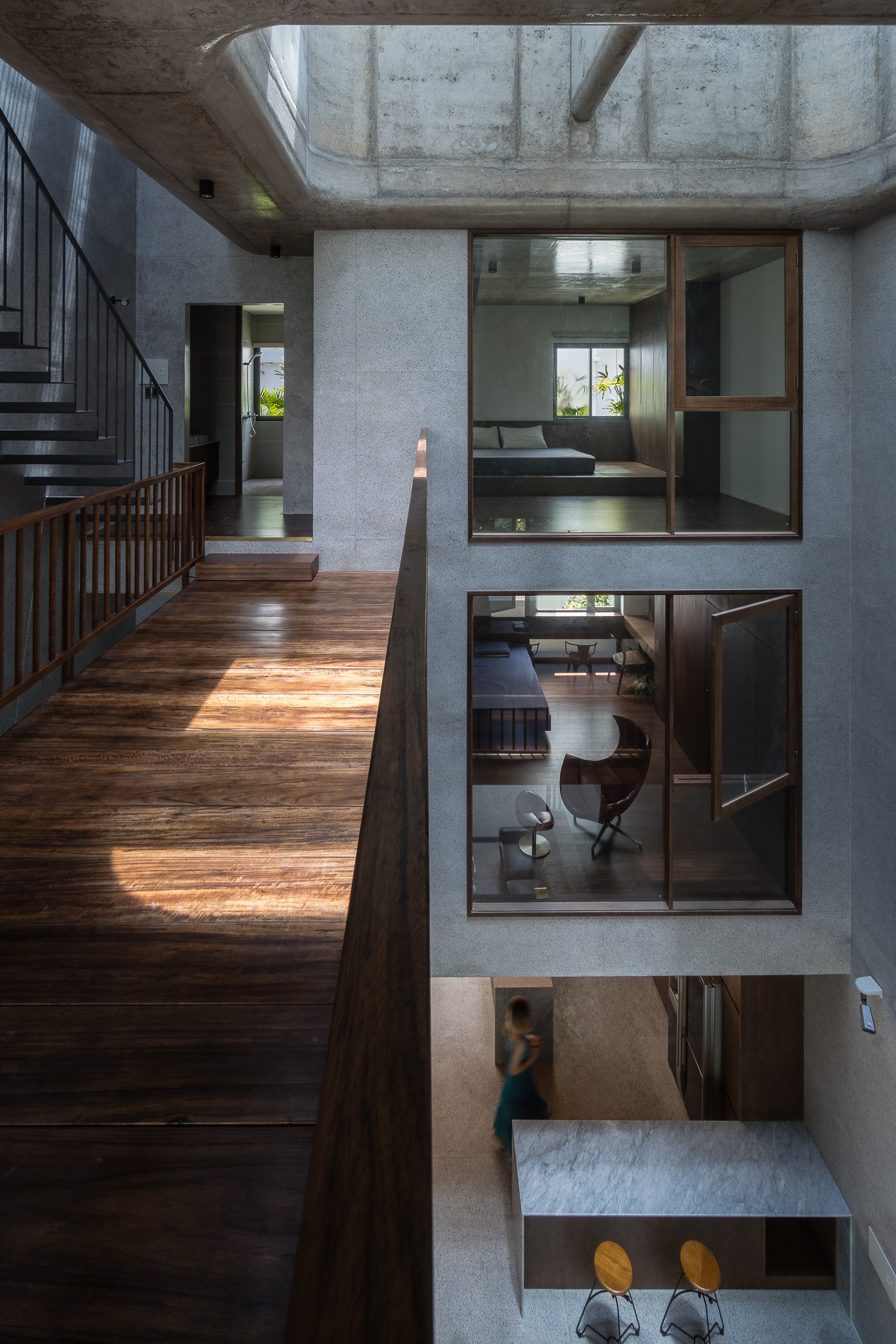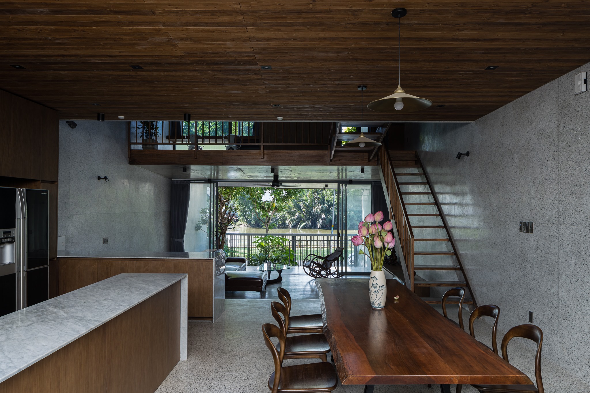 Ngoài các bất lợi trên, căn nhà có lợi thế nhìn ra sông, diện tích đủ lớn để bố trí phòng ốc. Để đáp ứng các yêu cầu của gia chủ và tạo ra không gian sống phù hợp với gia đình năm người, các kiến trúc sư thiết kế các phòng của căn nhà nằm xung quanh một giếng trời lớn.