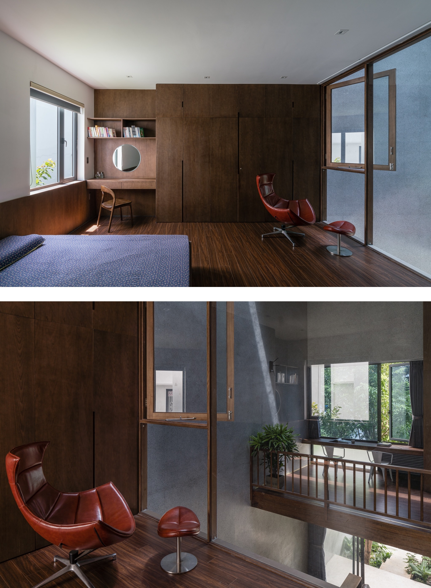 Phòng ngủ chính nằm sau phòng ngủ con. Giếng trời tạo khoảng trống lớn, mở tầm nhìn nên các phòng ngủ đều được bố trí ô cửa lớn để nhìn ra "view" sông trước nhà.