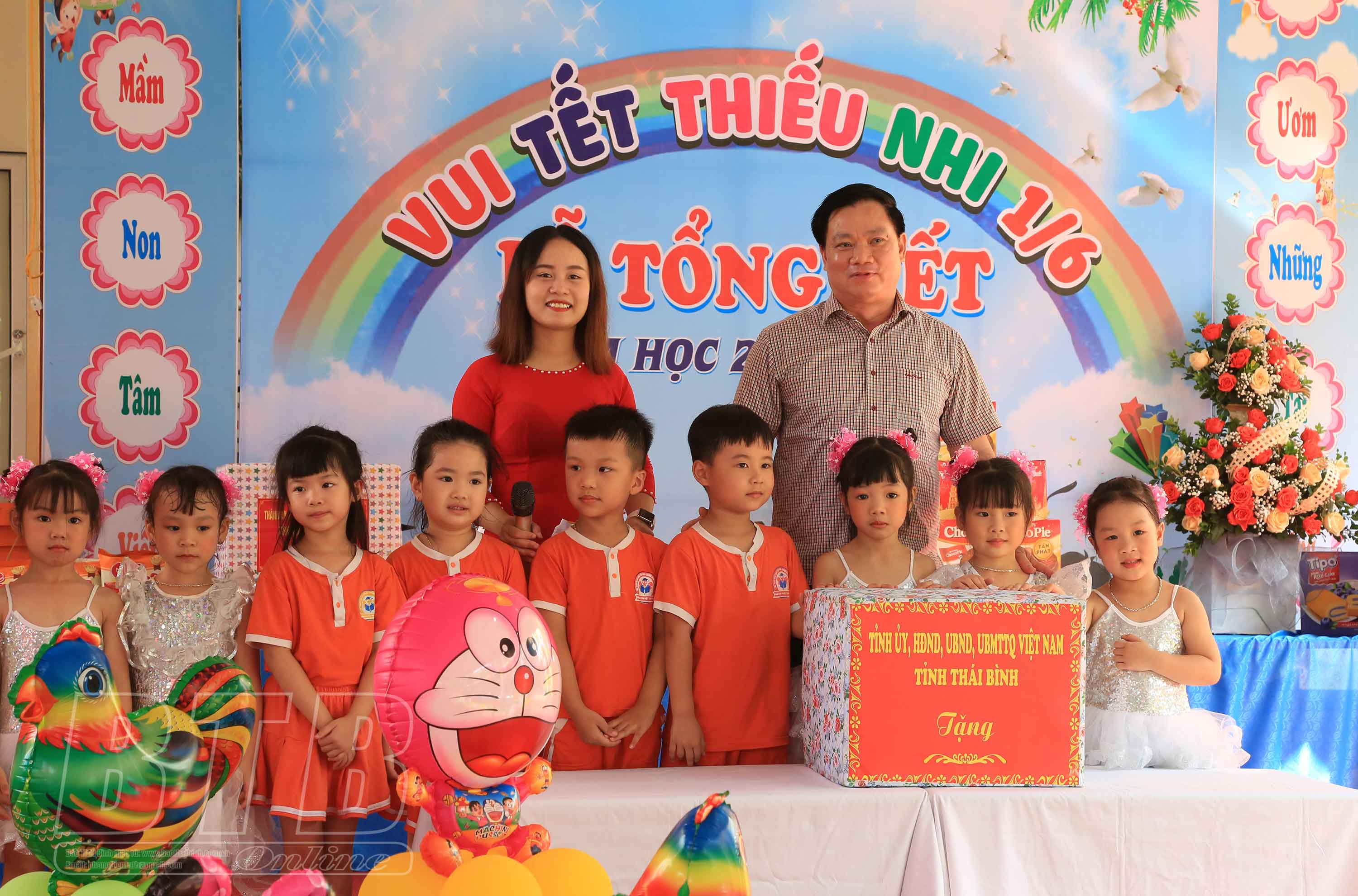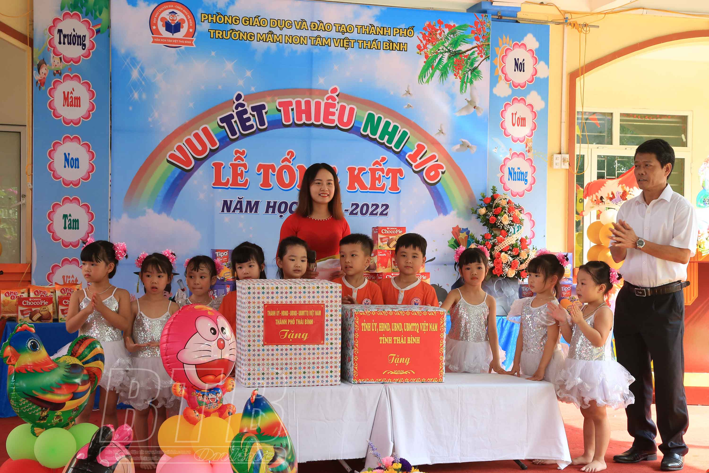 Đồng chí Hoàng Văn Thành, Ủy viên Ban Thường vụ Tỉnh ủy, Bí thư Thành ủy tặng quà các cháu thiếu nhi Trường Mầm non Tâm Việt Thái Bình.