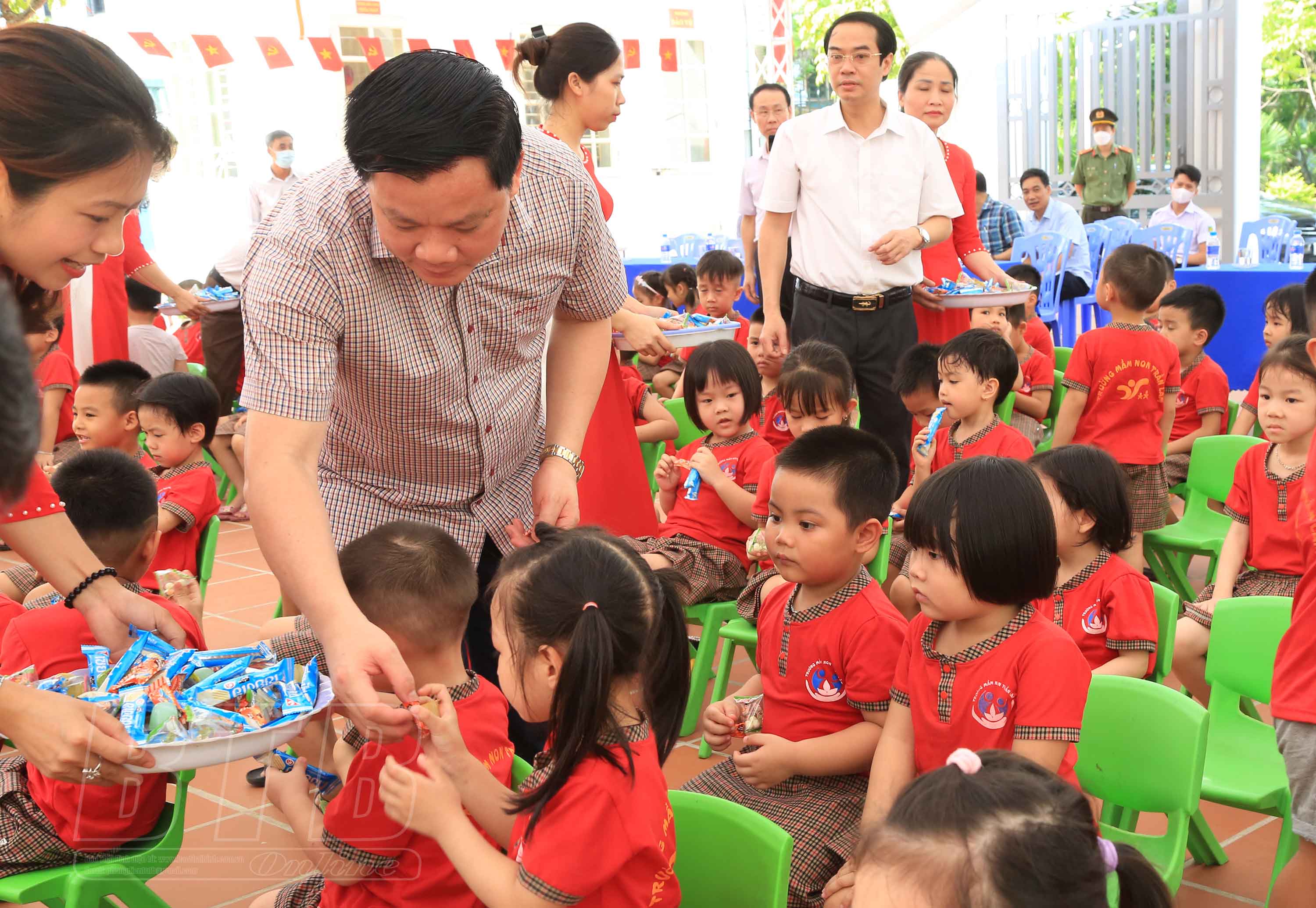Đồng chí Nguyễn Khắc Thận, Phó Bí thư Tỉnh ủy, Chủ tịch UBND tỉnh phát kẹo cho các cháu thiếu nhi Trường Mầm non Trần Lãm.