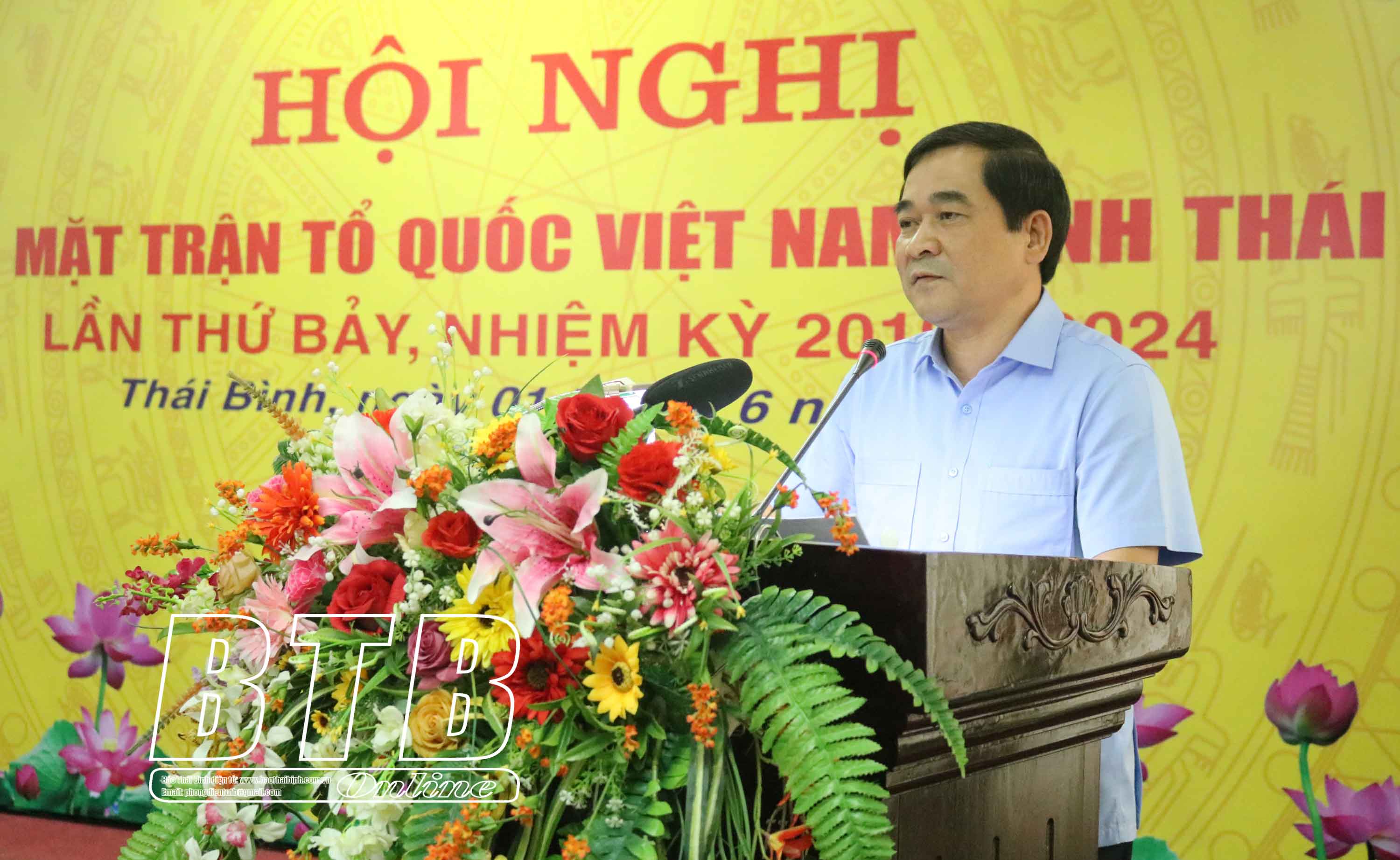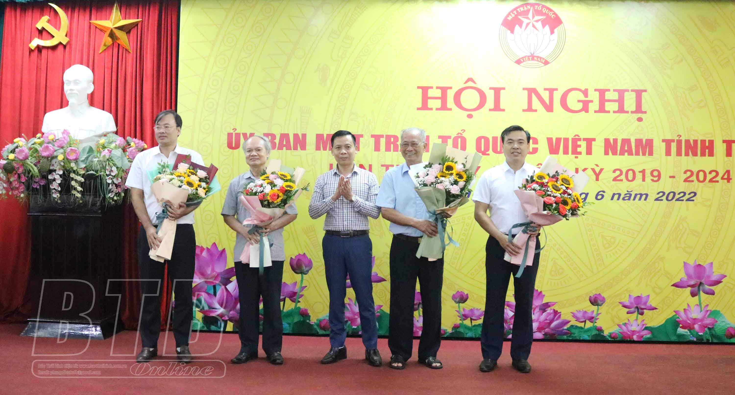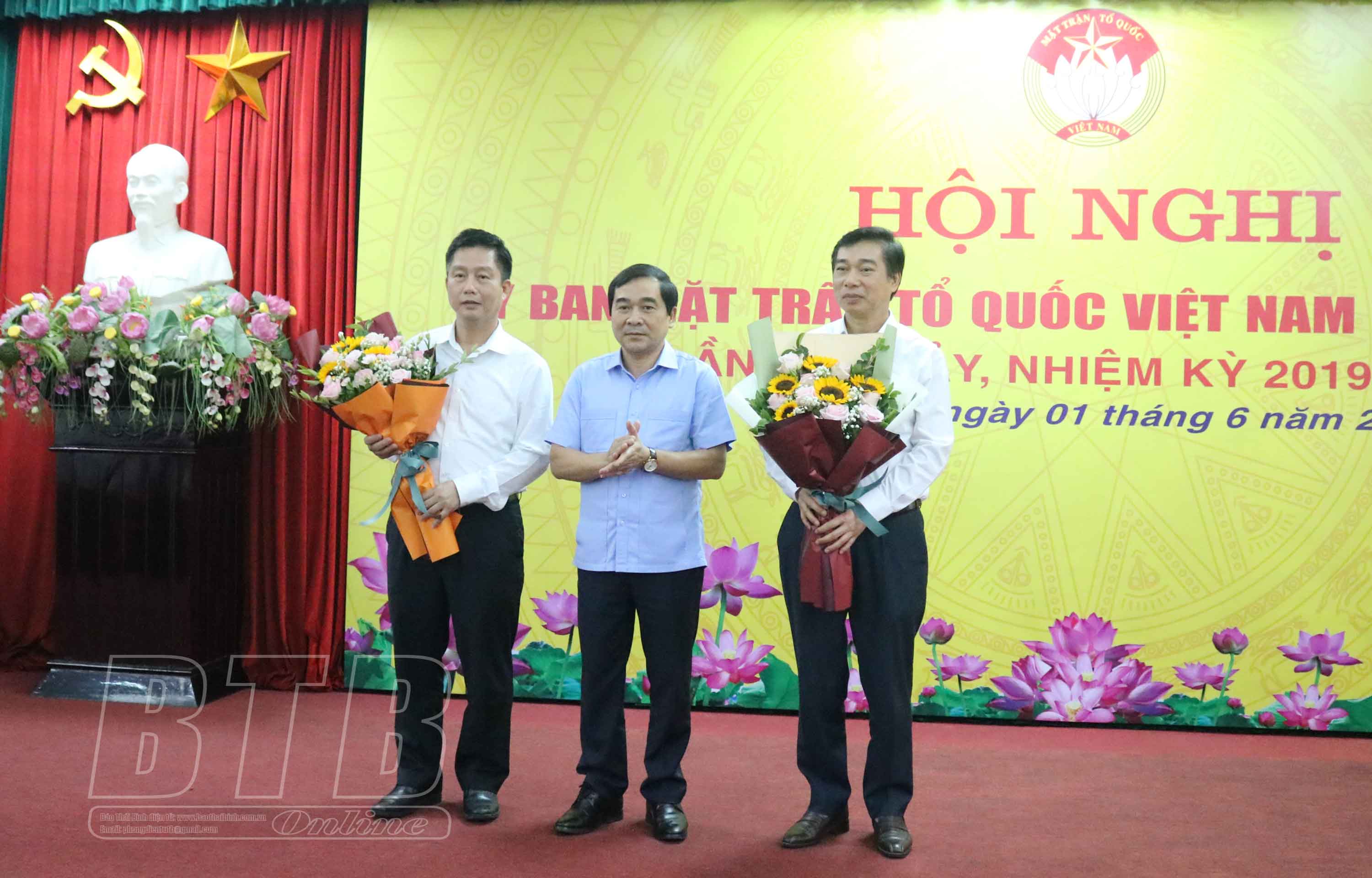 Đồng chí Nguyễn Tiến Thành, Phó Bí thư thường trực Tỉnh ủy, Chủ tịch HĐND tỉnh tặng hoa chúc mừng đồng chí Nguyễn Văn Giang, Ủy viên Ban Thường vụ, Trưởng ban Dân vận Tỉnh ủy hoàn thành nhiệm vụ và đồng chí Vũ Thanh Vân được hiệp thương cử giữ chức Chủ tịch Ủy ban MTTQ tỉnh Thái Bình, nhiệm kỳ 2019 - 2024.