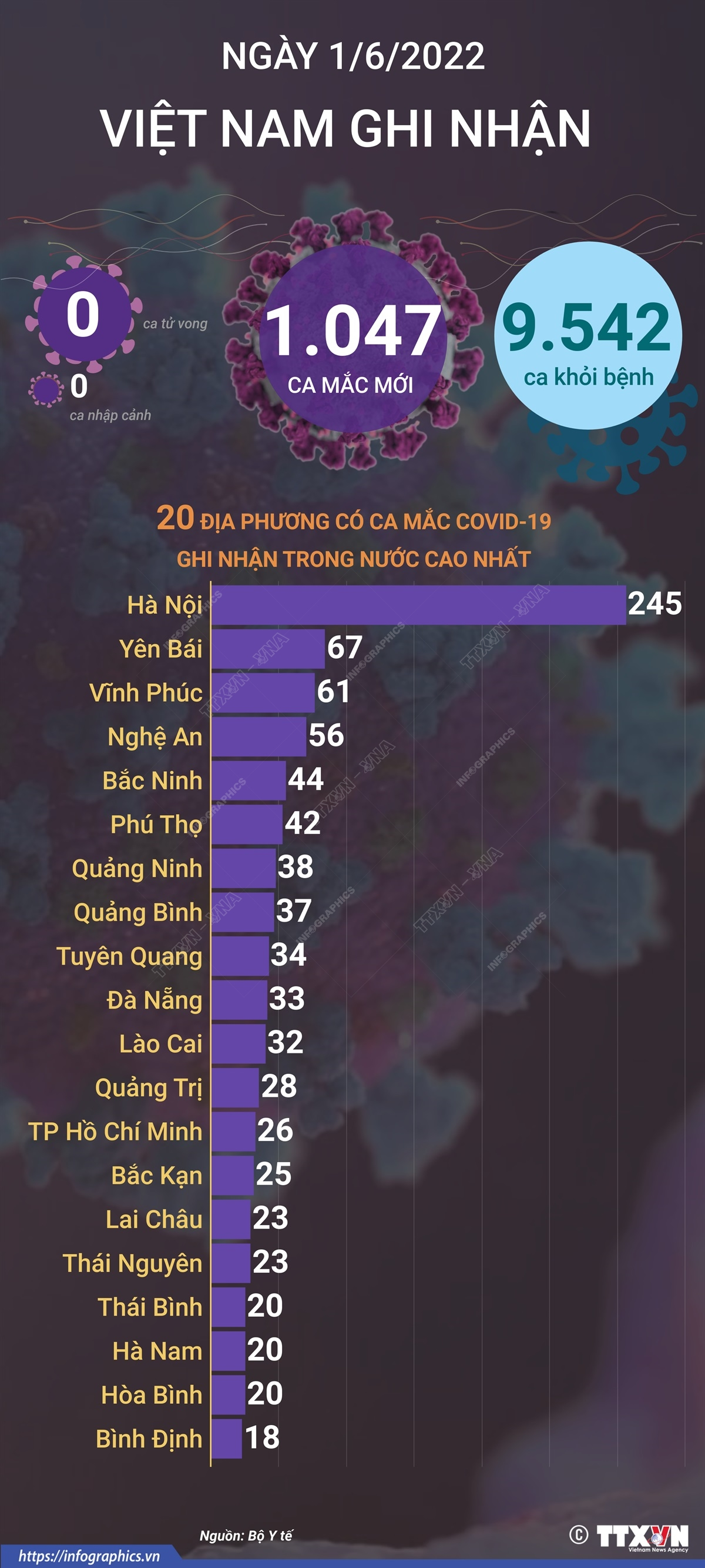 Theo Bộ Y tế, tính từ 16h ngày 31/5 đến 16h ngày 1/6/2022, Việt Nam ghi nhận 1.047 ca mắc mới COVID-19 tại 40 tỉnh, thành phố