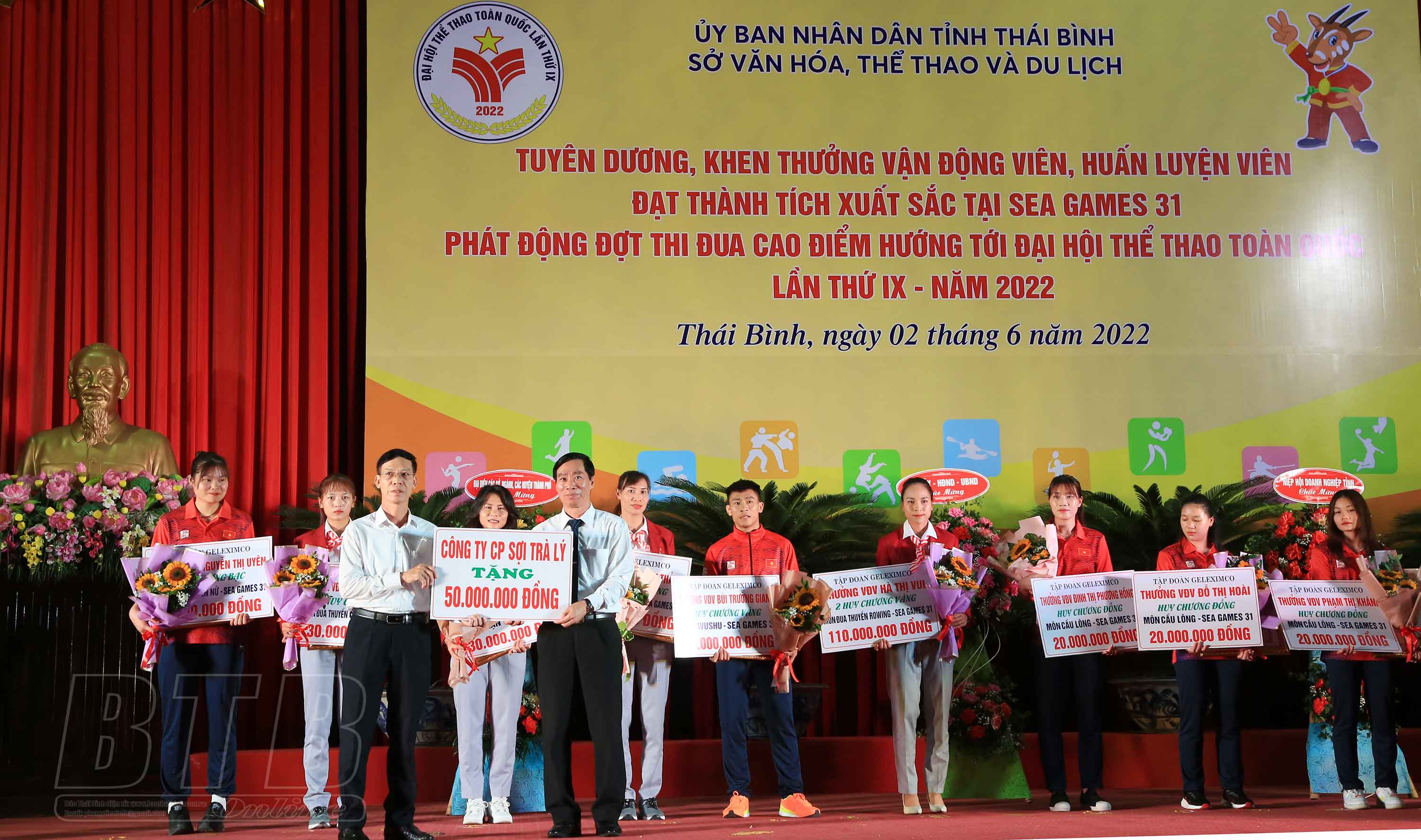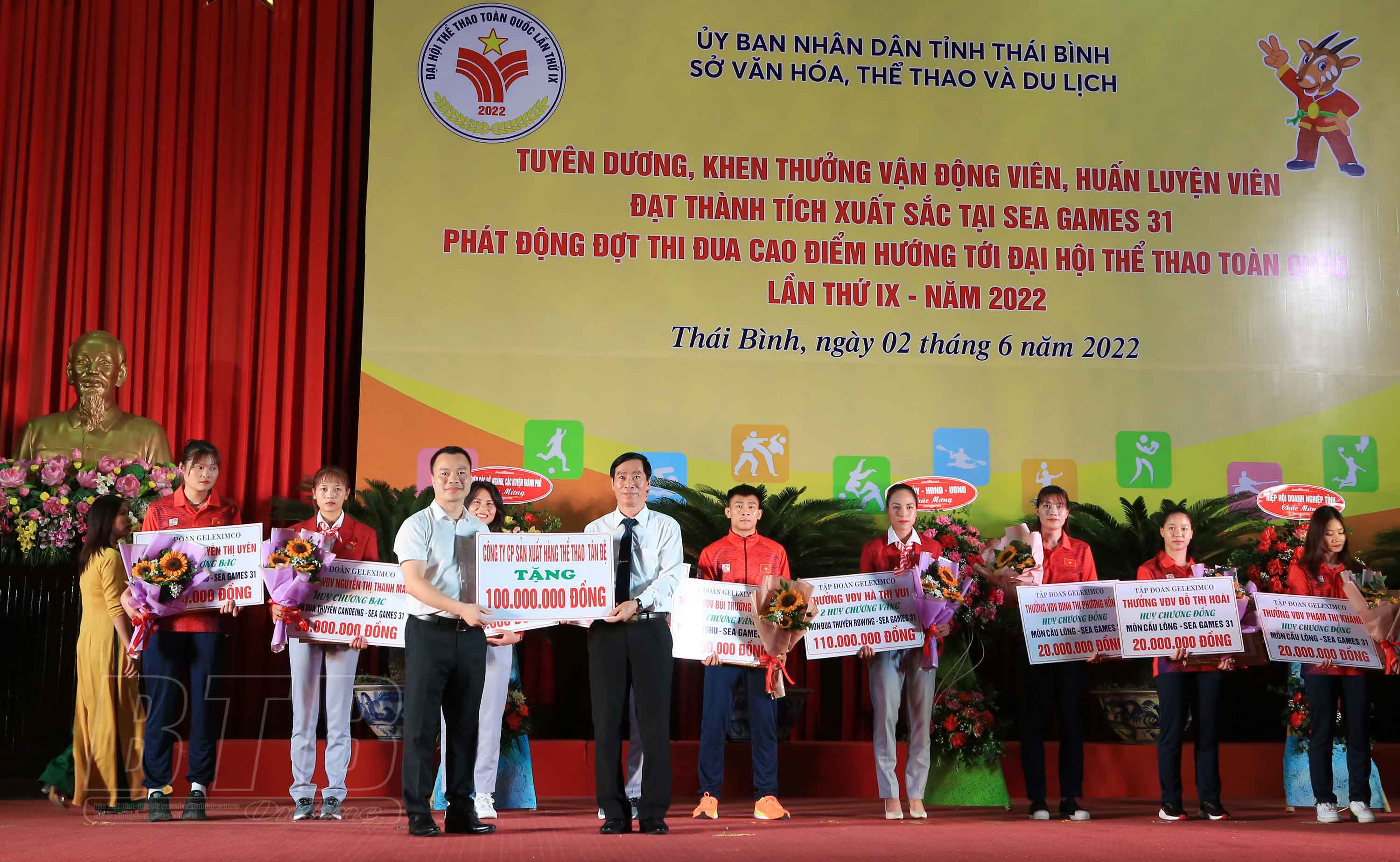 Các nhà tài trợ, các doanh nghiệp, cơ quan, tổ chức trao tặng quà, tiền thưởng và nguồn tài trợ cho các VĐV và các đội tuyển thể thao của tỉnh Thái Bình tham gia thi đấu tại Đại hội Thể thao toàn quốc lần thứ 9 năm 2022.