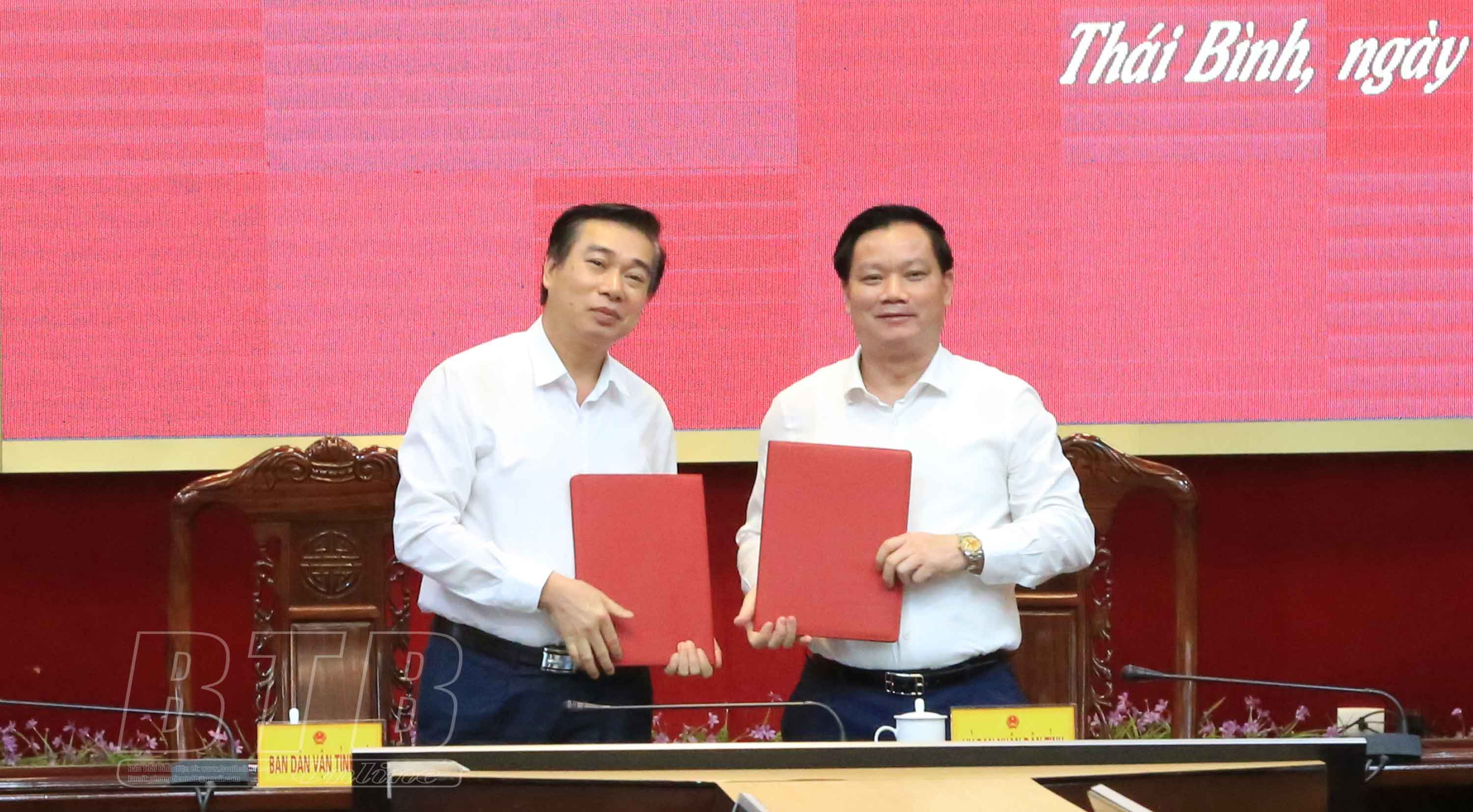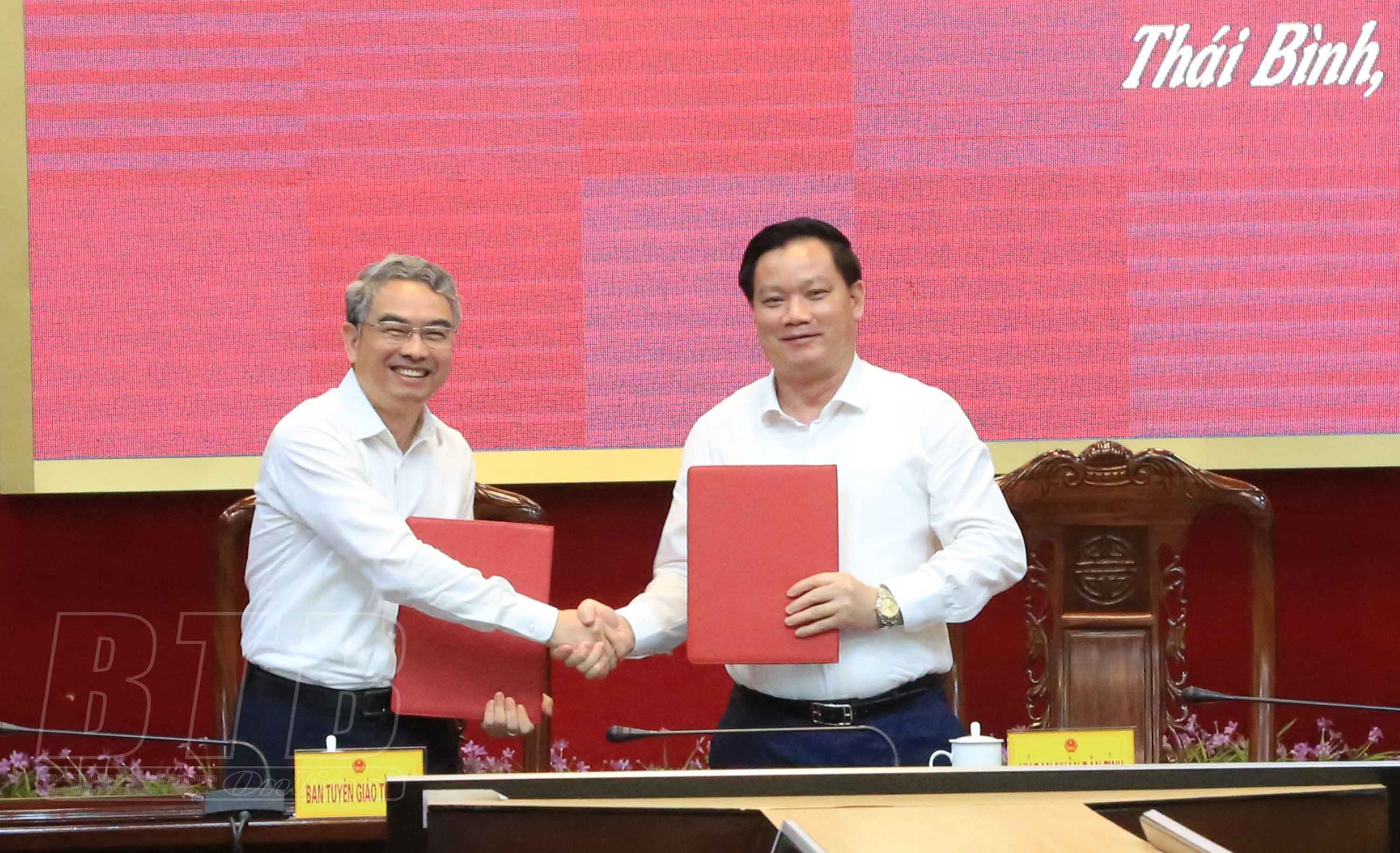 Đồng chí Nguyễn Khắc Thận, Phó Bí thư Tỉnh ủy, Bí thư Ban Cán sự đảng UBND tỉnh, Chủ tịch UBND tỉnh và đồng chí Phạm Đồng Thụy, Ủy viên Ban Thường vụ, Trưởng ban Tuyên giáo Tỉnh ủy ký kết chương trình phối hợp giữa UBND tỉnh với Ban Tuyên giáo Tỉnh ủy.