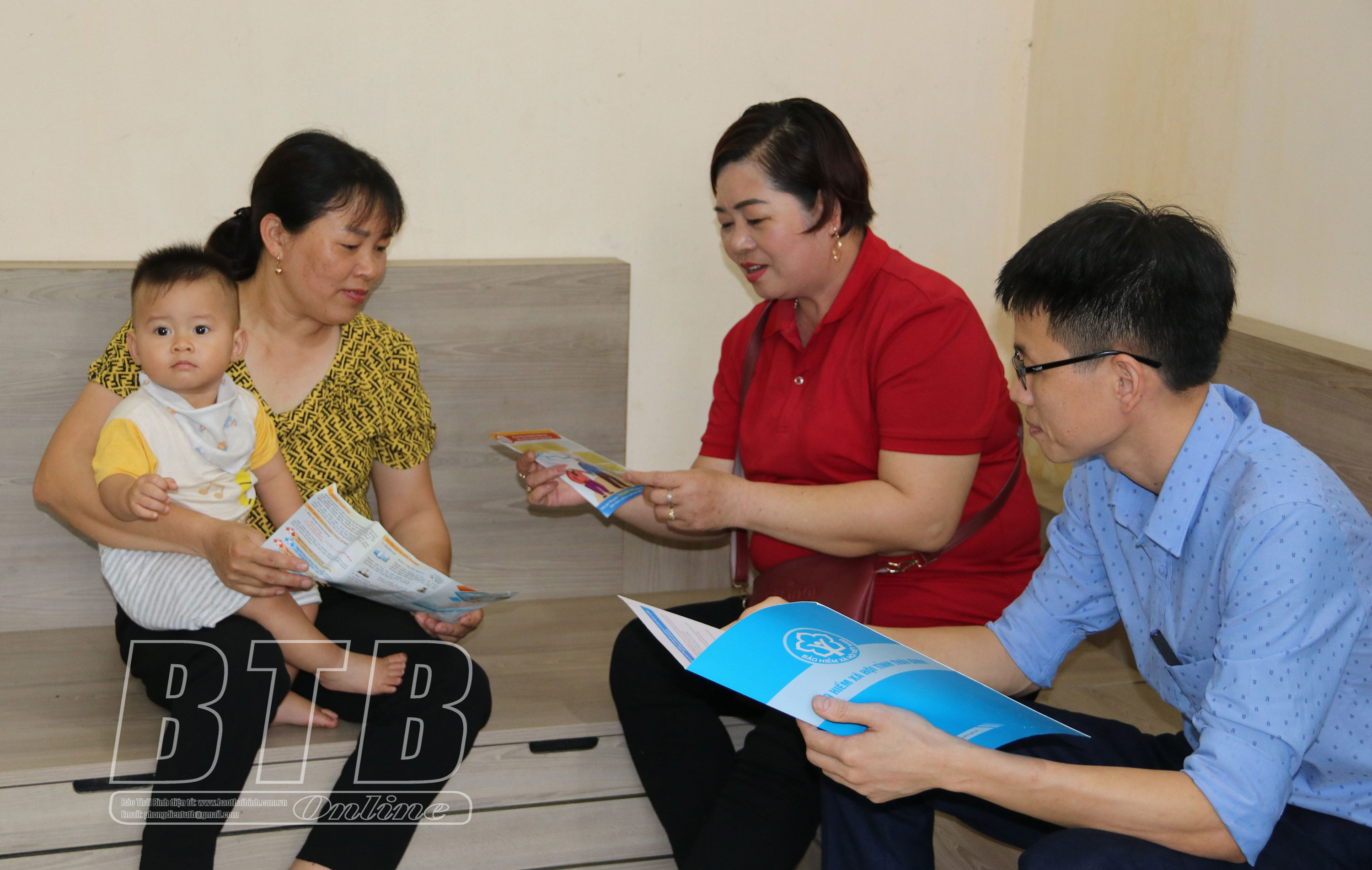 Người dân xã Hồng Lý (Vũ Thư) được cán bộ bảo hiểm và nhân viên đại lý thu tuyên truyền chính sách BHXH tự nguyện.