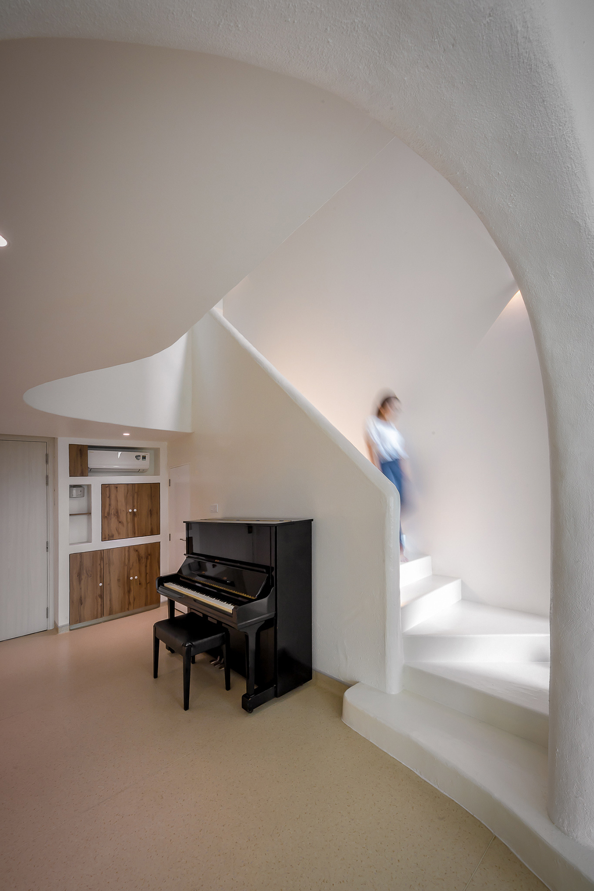 Tầng dưới là điểm giao thông kết nối tất cả không gian trong nhà. Đàn piano được đưa vào sảnh trệt, với khoảng thông tầng giúp cả nhà đều có thể thưởng thức tiếng đàn dù đang ở bất kỳ phòng nào.