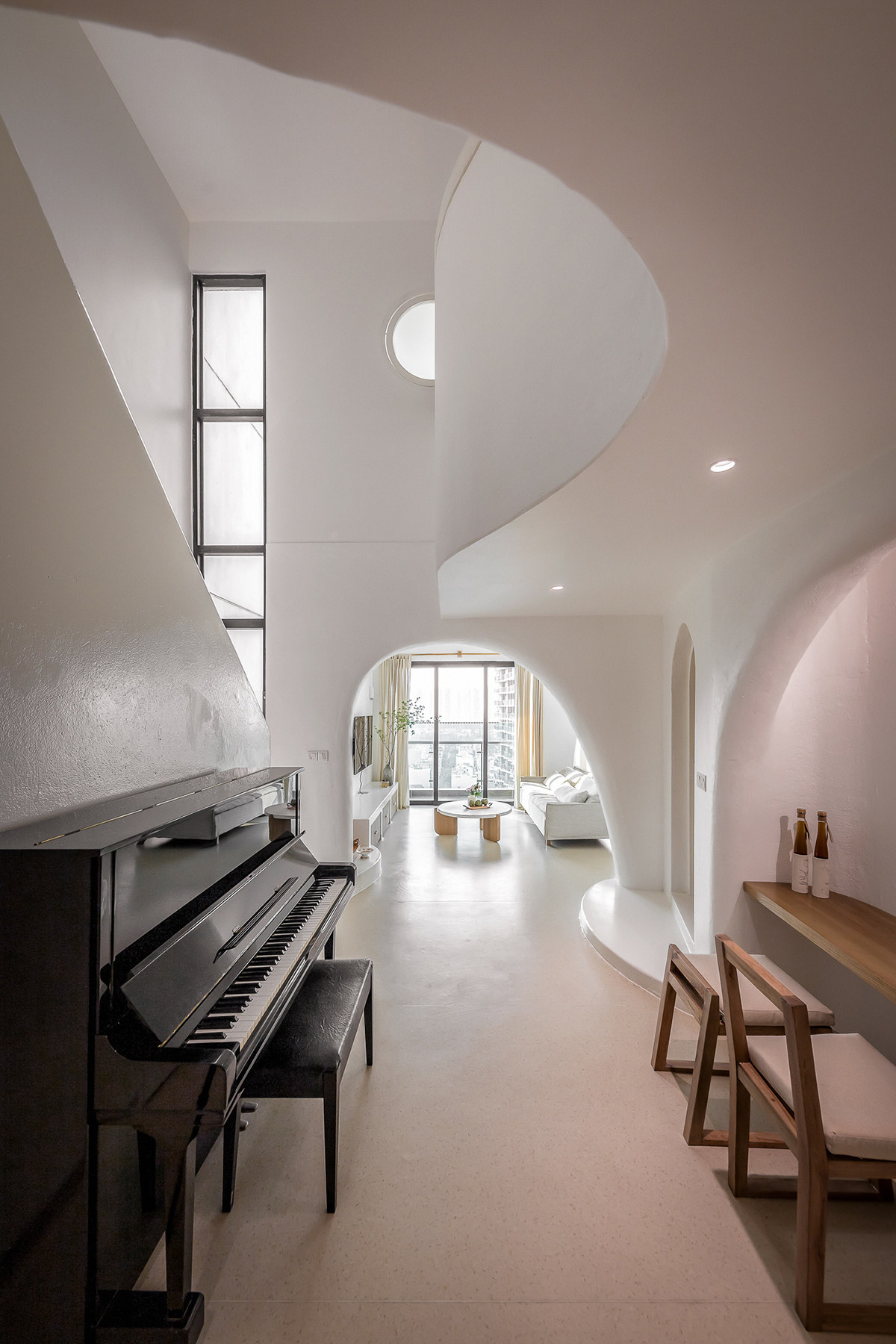 Từ ngoài cửa chính nhìn thẳng vào là không gian phòng khách và sinh hoạt chung qua hệ cung vòm chính. Đường nét bố cục kết cấu trong căn hộ được thiết kế theo các đường cong tự nhiên bất đối xứng để xóa đi cảm giác ngăn chia góc cạnh thường thấy trong các căn hộ chung cư.