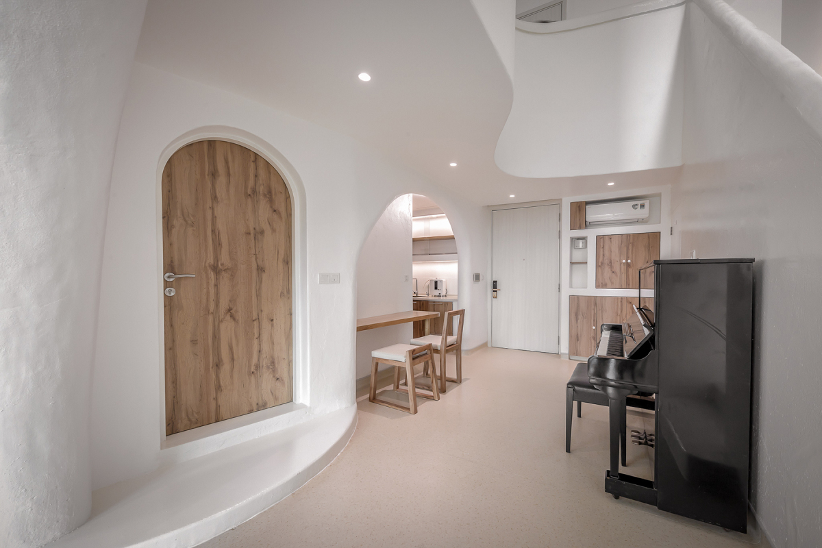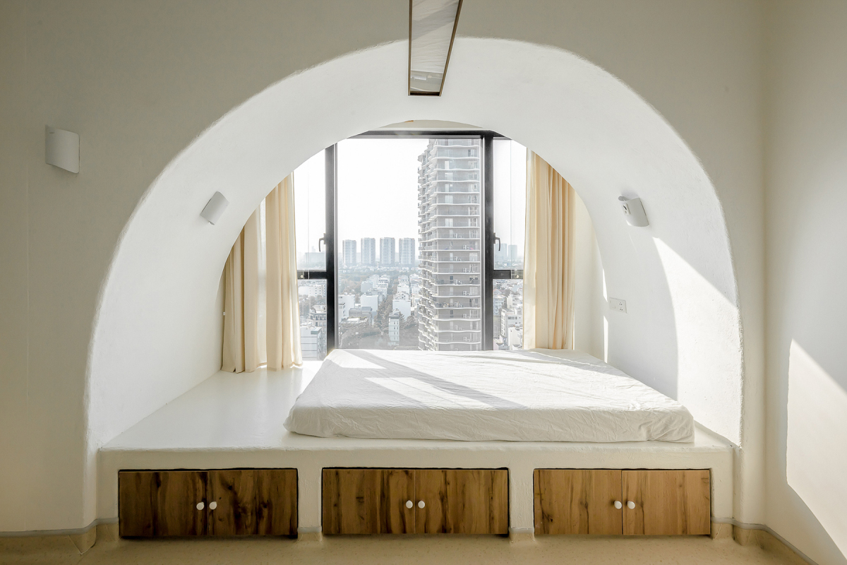 Các vòm sơn trắng với biện pháp thi công nửa thô, nửa hoàn thiện kết hợp với màu nâu ấm của đồ gỗ, tạo nên cảm giác mộc mạc gần gũi. Toàn bộ tường được thi công xoa bằng găng tay tạo cảm giác thô mộc, tự nhiên. Chủ nhà cho biết, họ không có cảm giác đang ở trong một "chiếc hộp" căn hộ cao tầng.