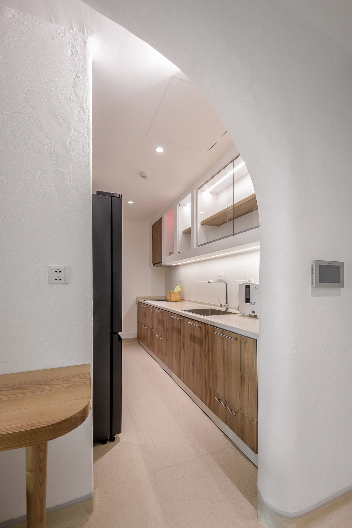 Bên tay trái ẩn sau bức tường cong là khu bếp và giặt phơi. Do nhu cầu nấu nướng đơn giản, khu vực bếp được bố trí tinh giản, gọn gàng. Các thiết bị bếp, phụ kiện bếp được giấu trong hệ tủ bên dưới. Mặt bếp sử dụng đá nhân tạo màu kem trùng tông với màu sàn nhà mang lại không gian đồng nhất.