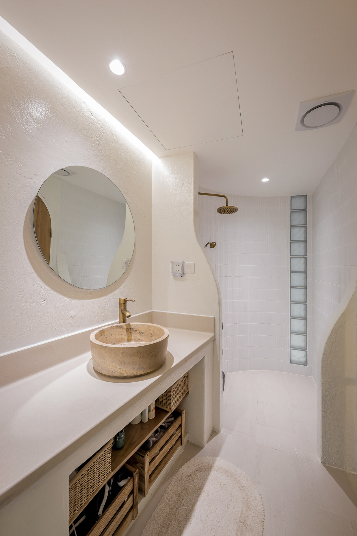 Tường nhà vệ sinh ốp đá mosaic sọc trắng theo tường cong, ý tưởng thiết kế xuyên suốt công trình. Thiết bị của nhà vệ sinh bằng đá cùng tông màu gỗ.