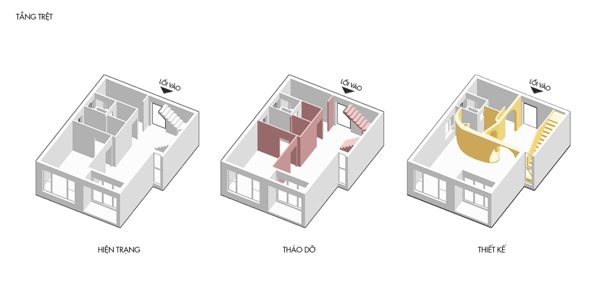 Gia chủ lại không có nhu cầu sử dụng tới ba phòng ngủ nên kiến trúc sư đã bỏ đi một phòng ngủ ở tầng trệt, nhập chung không gian với phòng khách, mở rộng không gian sinh hoạt. Nhận thấy cầu thang chữ U bên trái cửa choán không gian lối vào, kiến trúc sư đã xoay cầu thang về phía sát tường biên căn hộ để không gian thông tầng được mở rộng tối đa.