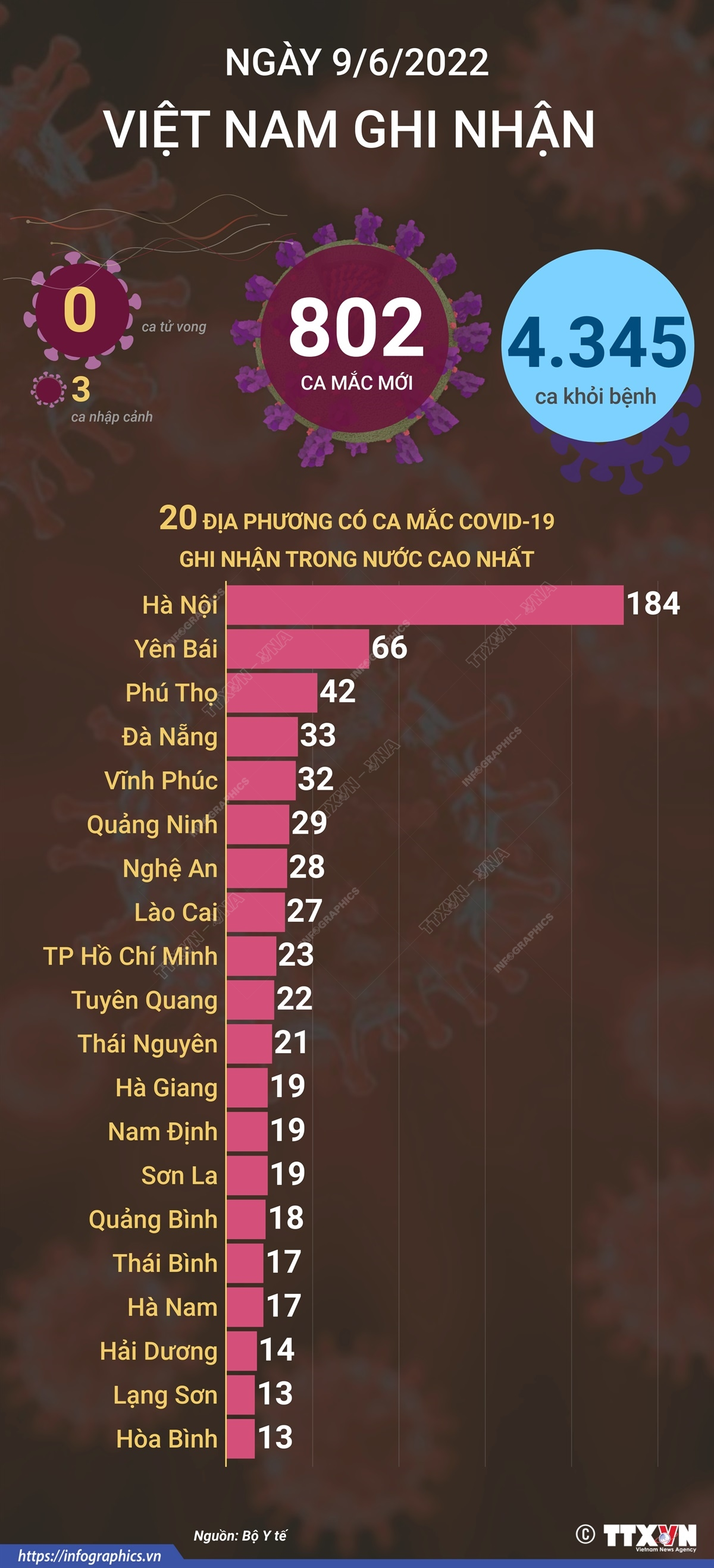 Theo Bộ Y tế, tính từ 16h ngày 8/6 đến 16h ngày 9/6/2022, Việt Nam ghi nhận 802 ca mắc mới COVID-19, trong đó có 3 ca nhập cảnh, 799 ca trong nước tại 45 tỉnh, thành phố