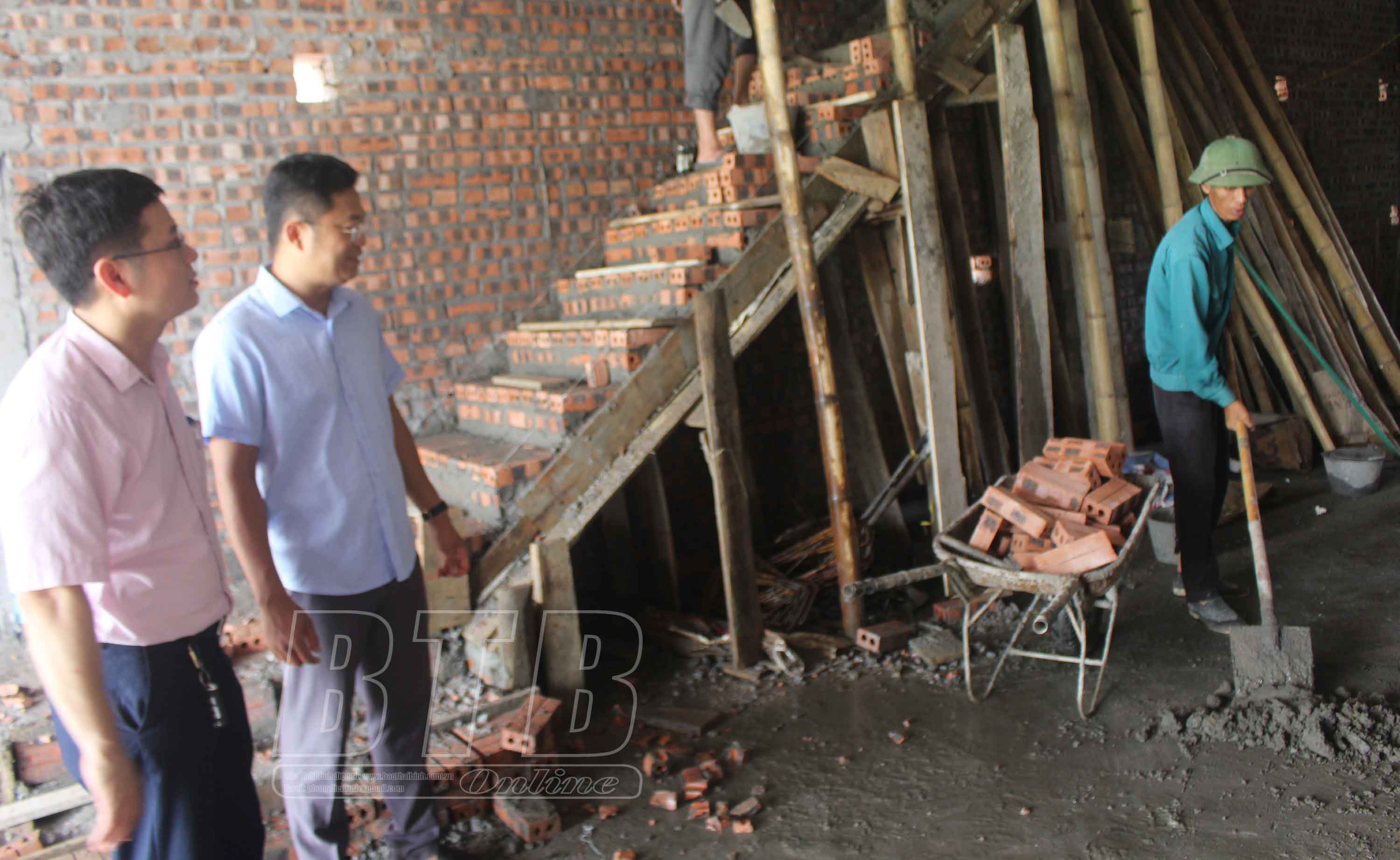 Cán bộ Phòng giao dịch Ngân hàng CSXH huyện Thái Thụy kiểm tra việc sử dụng vốn vay chương trình cho vay nhà ở xã hội của gia đình anh Nguyễn Hoài Nam.
